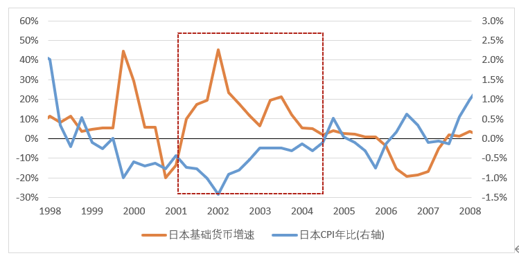 我們來看幾個例子,先來看 2000 年的日本,1990 年日本股市和地產泡沫破裂,1999 年經濟陷入通縮,2001 年 3 月份日央行首創「量化寬鬆」 (Quantitative easing, QE) ,直接購買日本長期國債,購買目標從 4.8 兆日元/年一路提高至 14.4 兆/年,帶動日本基礎貨幣增速一度升至 45%。