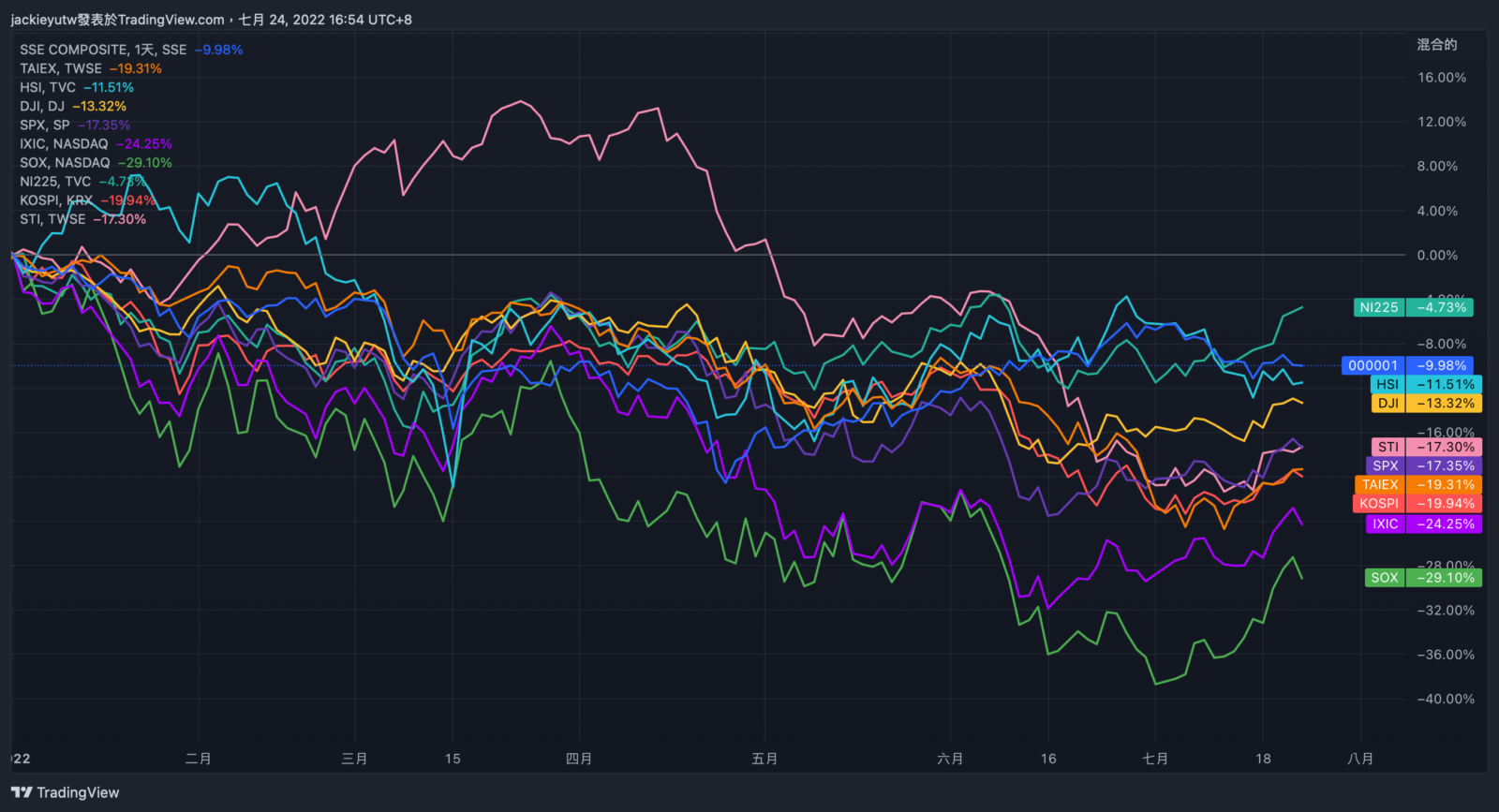 如果把全球資本市場今年以來漲幅做對照,會發現跌勢較輕的股市,除了日經 225 指數 (NI225) ,今年以來跌幅 4.7% 較輕外,上證指數 (000001) 與港股 (HSI) 相對其他股市也較輕,跌幅都在 10% 左右,今年表現好過東亞的台灣股市、南韓股市,與美國四大指數,這波陸股的反彈來自四月底五月初,當時對上海即將解封的提前反應。
