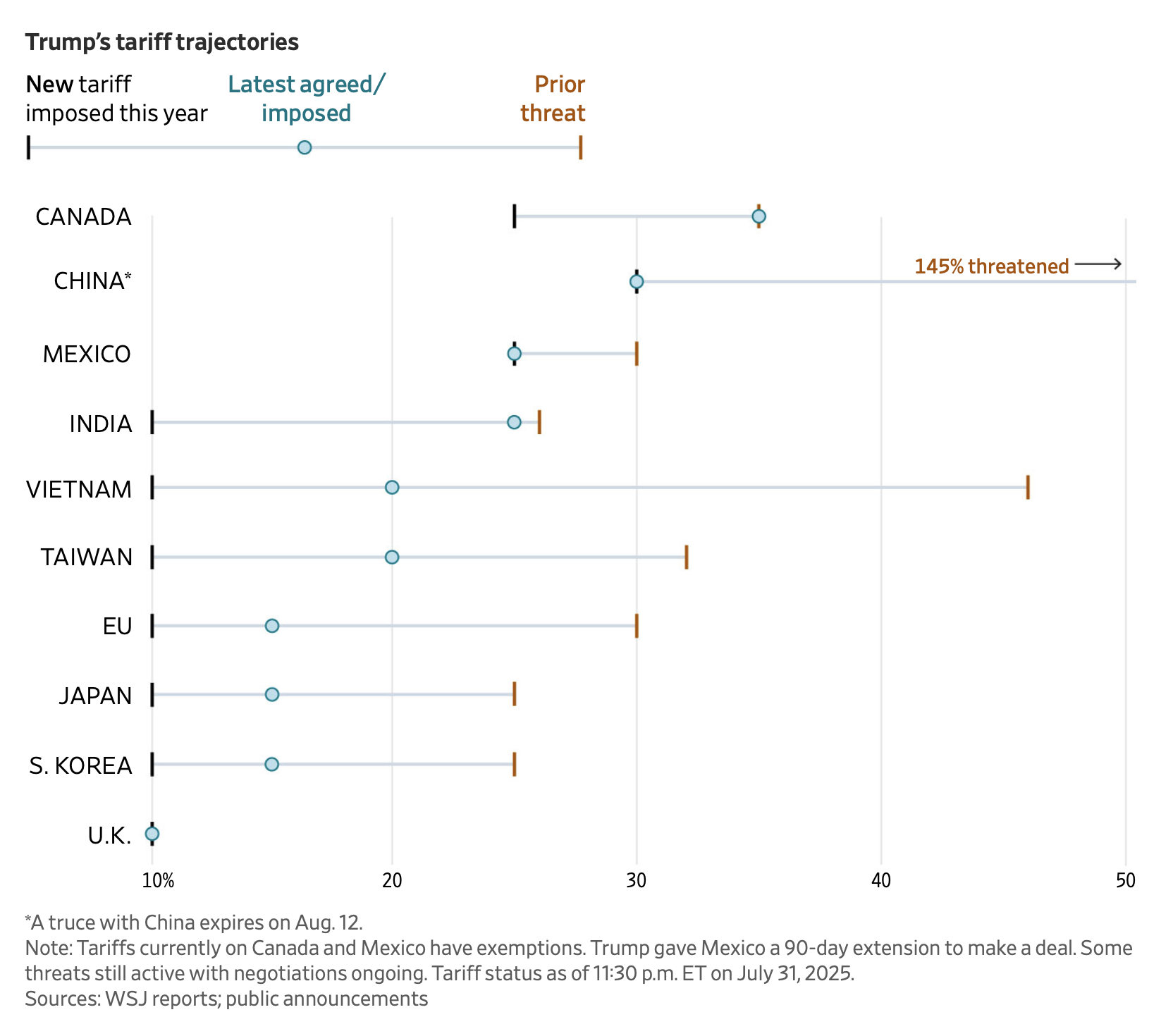 台灣稅率則調升至 20%,高於原先 10%,但低於威脅的 32%,半導體與 iPhone 等品項則暫不納入,越南則達成協議為 20%,避免先前所威脅的 46% 稅率,並針對轉運商品額外加徵 40%。