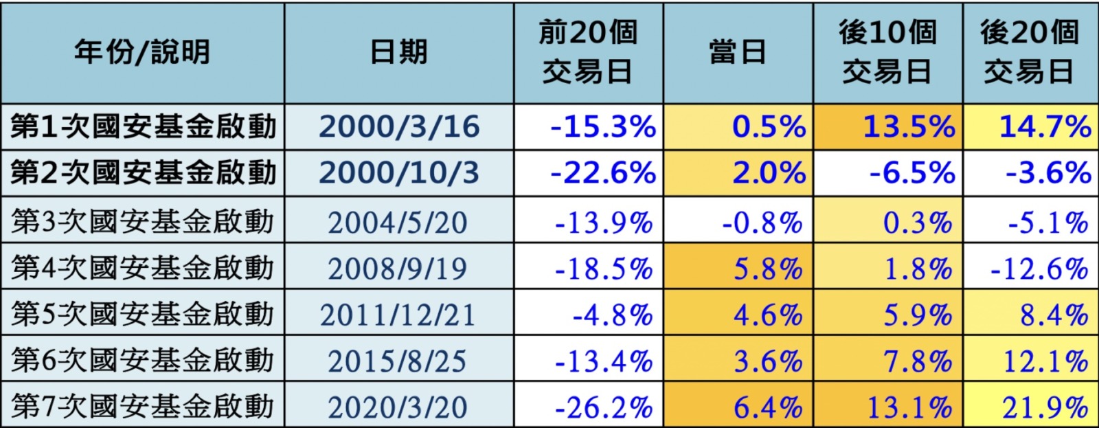 - 因為在 2000 年 3 月、2000 年 10 月與 2008 年 9 月,宣布進場時間都是台股的山頂或是半山腰,後續跌幅都曾高達兩成到三成,國安基金只是因為退場時間比較晚,所以看起來績效不錯,真正的問題是,國安基金短則護盤 5 天,長則可以護到 232 天,其實很難掌握投入步調,如果國安基金一進場,我們就跟著大舉買入,很有可能會陷入嚴重套牢。