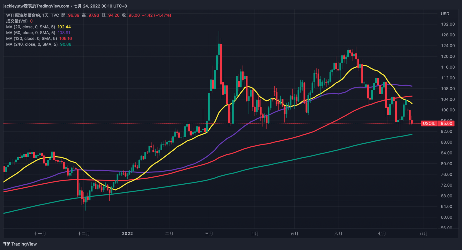 - 許多投資朋友知道,我在 6 月份聽友會已經多次表明,對今年大宗資產極度看空,本來我沒想在資產操作部位分享過於投機性的操作,但因為也動用到個人資金,決定一併記錄在操作日誌內,本週二我在西德州原油站回百元大關後,買入少量反向型原油 ETF,來測驗我對原油下半年的觀察,能否達到油價從高點腰斬的效果,並以 110 元季線附近作為停損點,之所以不用海期下單,是因為我對原油的判斷,不是短期技術操作,而是中期空頭趨勢,為了避免有可能遇到持續轉倉的麻煩性,決定以 ETF 方式降低波動度,但此操作具高度投機性,投資者可不必列入資產配置考量。