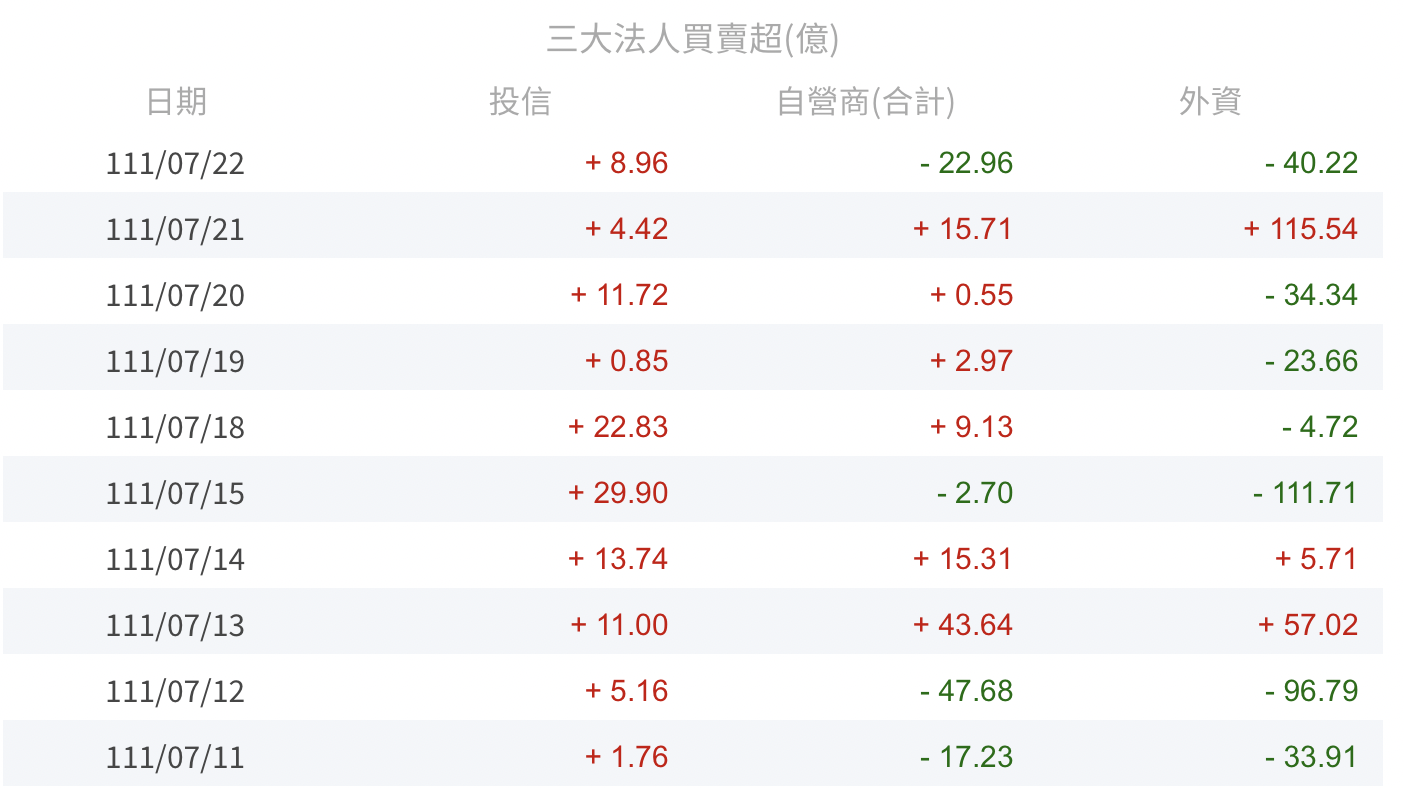 - 從 7/12 國安基金宣布護盤後,台股從低點已反彈千點,漲幅 7.3%,但如果觀察三大法人買賣超,會發現在過去兩週,內資投信連買兩週,但外資只買了三天,剩下的七天都持續在倒貨,這說明了國安基金護盤的確讓內資與散戶有追買意願,但國際股市的彈幅,似乎沒有特別對台股有明顯買盤效果。