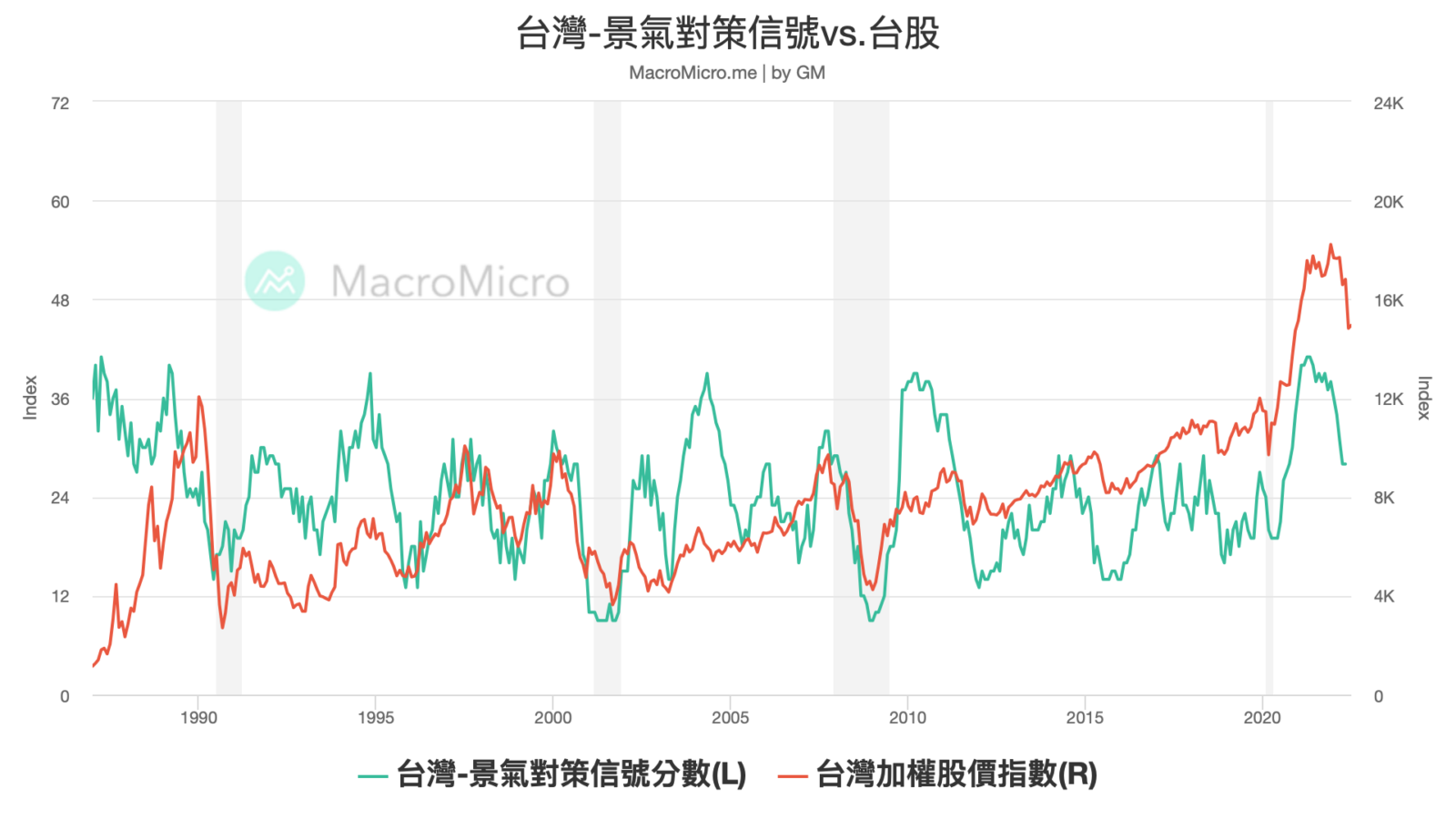 - 如果以景氣信號燈觀察,台灣經濟跟隨國際經濟,有一個自然的景氣下行格局,通常景氣對策信號燈,也至少需滑落至 20 分左右才算絕對低點出現,來到景氣領先的極端值,而這項指標在去年中旬時早已提前股價下彎,這也是去年下旬我對台股開始保守的原因,因為這項只以過去角度看,具有一到兩個季度的領先效果,更具體的說,目前台股應該還在經歷主跌段,國安基因的進場破壞了短期的下跌,但改變不了中長期的景氣趨勢。