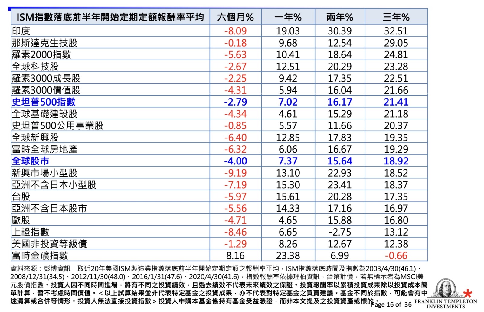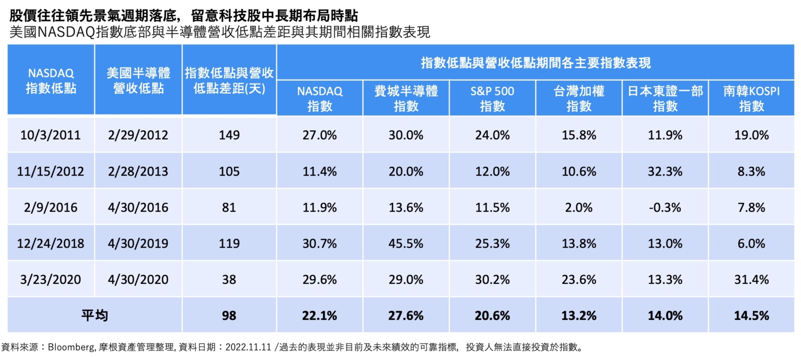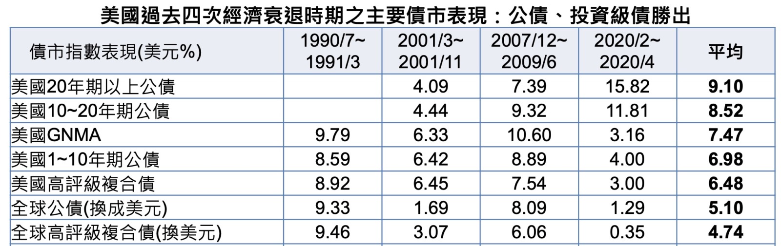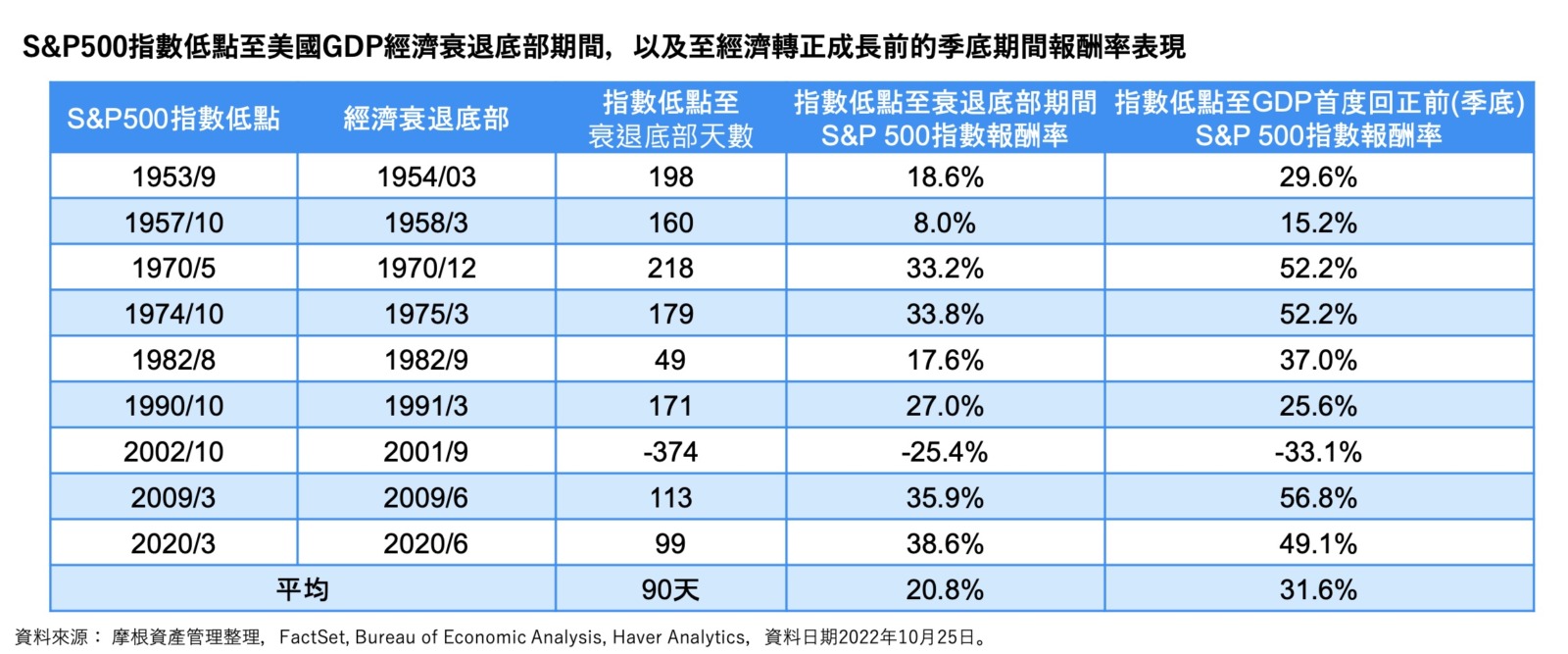 - 觀察過去幾次獲利下修循環,大盤跌幅主要集中在下修初期 (約 1~2 季),隨後進入震盪期 (約 2~3 季),一旦企業獲利與實際獲利開始上修,大盤將隨基本面好轉及評價上修而出現大漲行情,以下列圖表可以羅列衰退前六到九個月佈局後的績效: