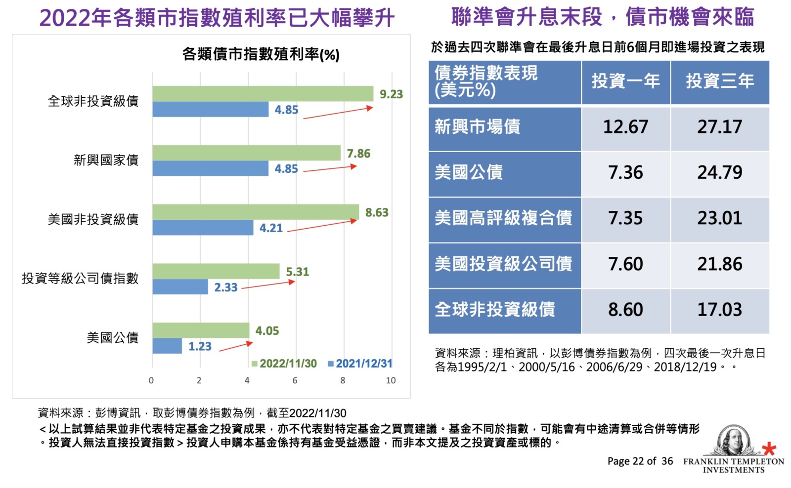 - 原本我的構想是,逐步攤低佈局至 5% 聯準會的政策終端目標利率,問題是最近幾個月公債殖利率已經停止上行,已經許久沒有購入公債,如果真的沒機會繼續攤低佈局就算了吧,至少股市部位夠大。至於在公債買入後的報酬,本次聽友會也做了詳盡說明,大家有空可以參考看看。