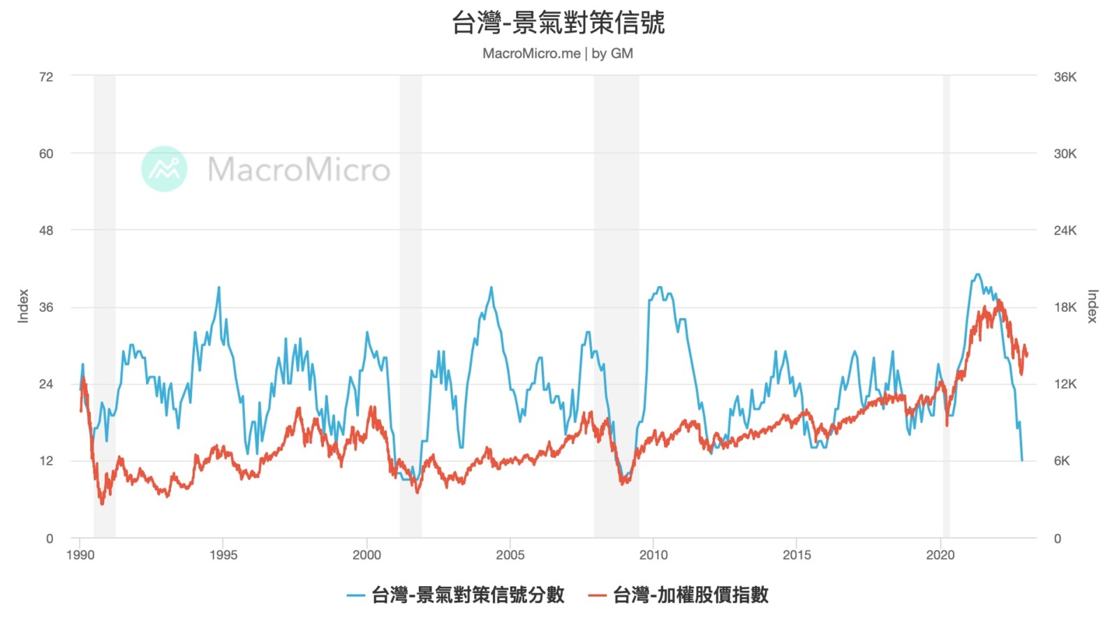 - 我去年主要加倉的台股部位是 006208 富邦台 50,2022 全年平均成本 61 元,績效報酬 3.6%,不過台股的預判有點失準,原本以為台股仍會出現持續性的崩跌段,但這次景氣信號藍燈居然會在萬四出現,讓我買的部位比美股小得多,但至少也是有買一定量了,不管如何,多數指標也暗示,台股來到低基期水位,過去在 2021 年忍的子彈,都盡可能在本輪衰退期攤低成本。