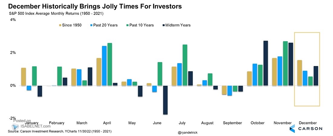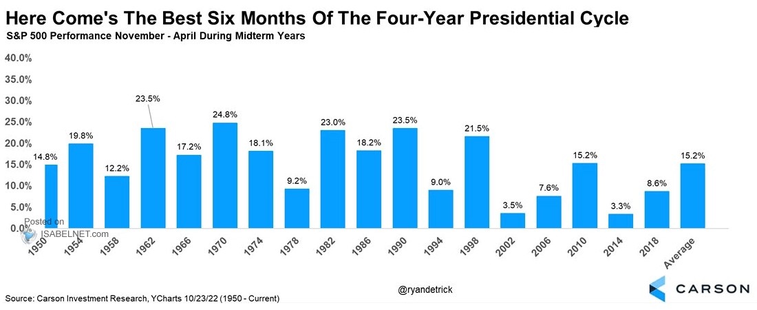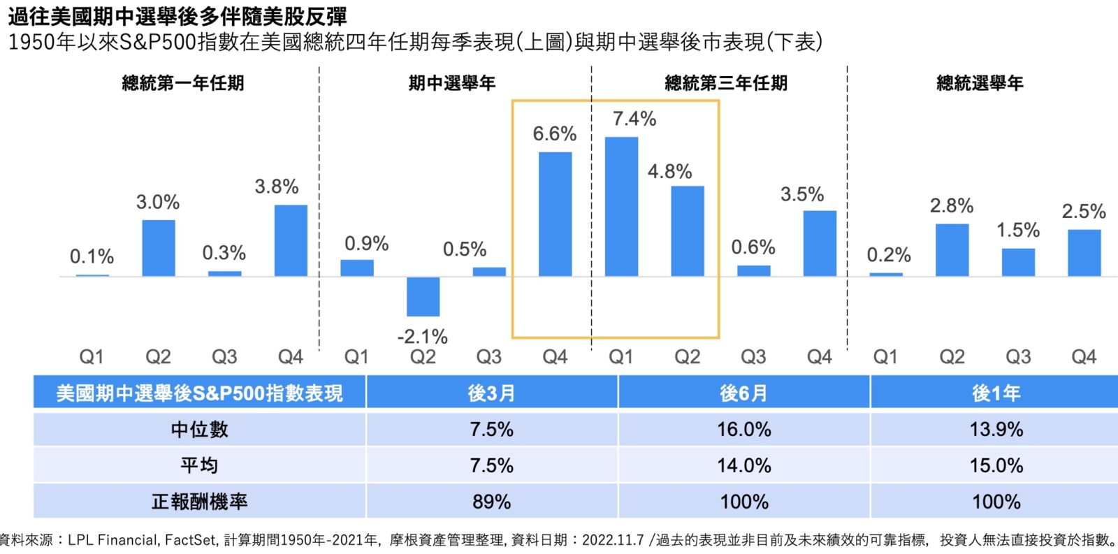 - 2.政治週期層面觀察,下方圖表示過去 70 年,美國在歷經期中選舉後六個月表現 (從 11 月到隔年四月),由於國會與政府由不同政黨主導對美股而言是好事,因為共和黨掌握眾議院後,白宮政策變動性不大,拜登的極左派政策難以通過,可以看見,除了消費旺季的傳統帶動,期中選舉年末到隔年初往往有不錯的亮麗表現。