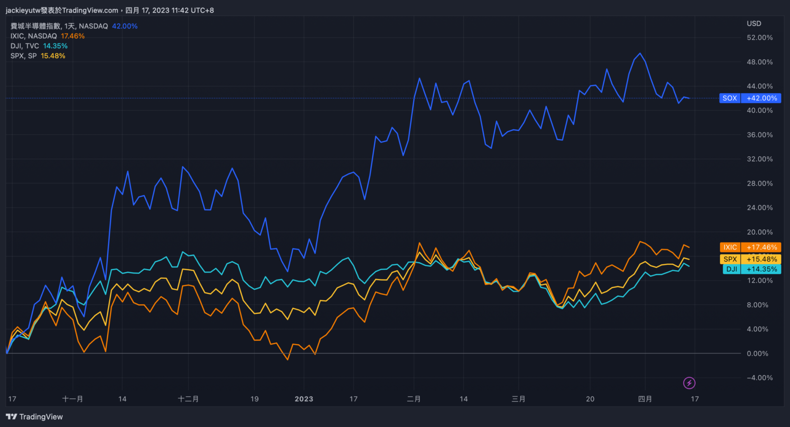 - 美股最近漲高休息,不過回調幅度很小,連能佈建的機會都沒有,從去年十月反彈以來,費半漲幅 42%,那指漲幅 17%,標普漲幅 15.4%,道瓊則有 14%,去年以來,我主要佈建是科技股的費半與那指,當時摔最重,現在也漲最兇,目前績效跟 4 月初差不多,保持在 17% 左右報酬,想來很有趣,現在美股還是衰退期,但股市居然已經反彈到這種位階。