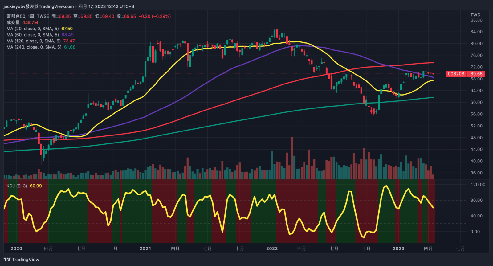 - 台股雖然在過去幾天逼臨萬六,但都是中小的櫃買在漲,我持有的權值型 ETF006208 聞風未動,已經保持在 69 塊長達一個季度,快要無聊死了,由於最近兩季,現金水位不斷推高,美股科技股漲太高不敢追,原本想趁台股基期回調時少量投入機會,結果乖離居然連一整年都在高位。