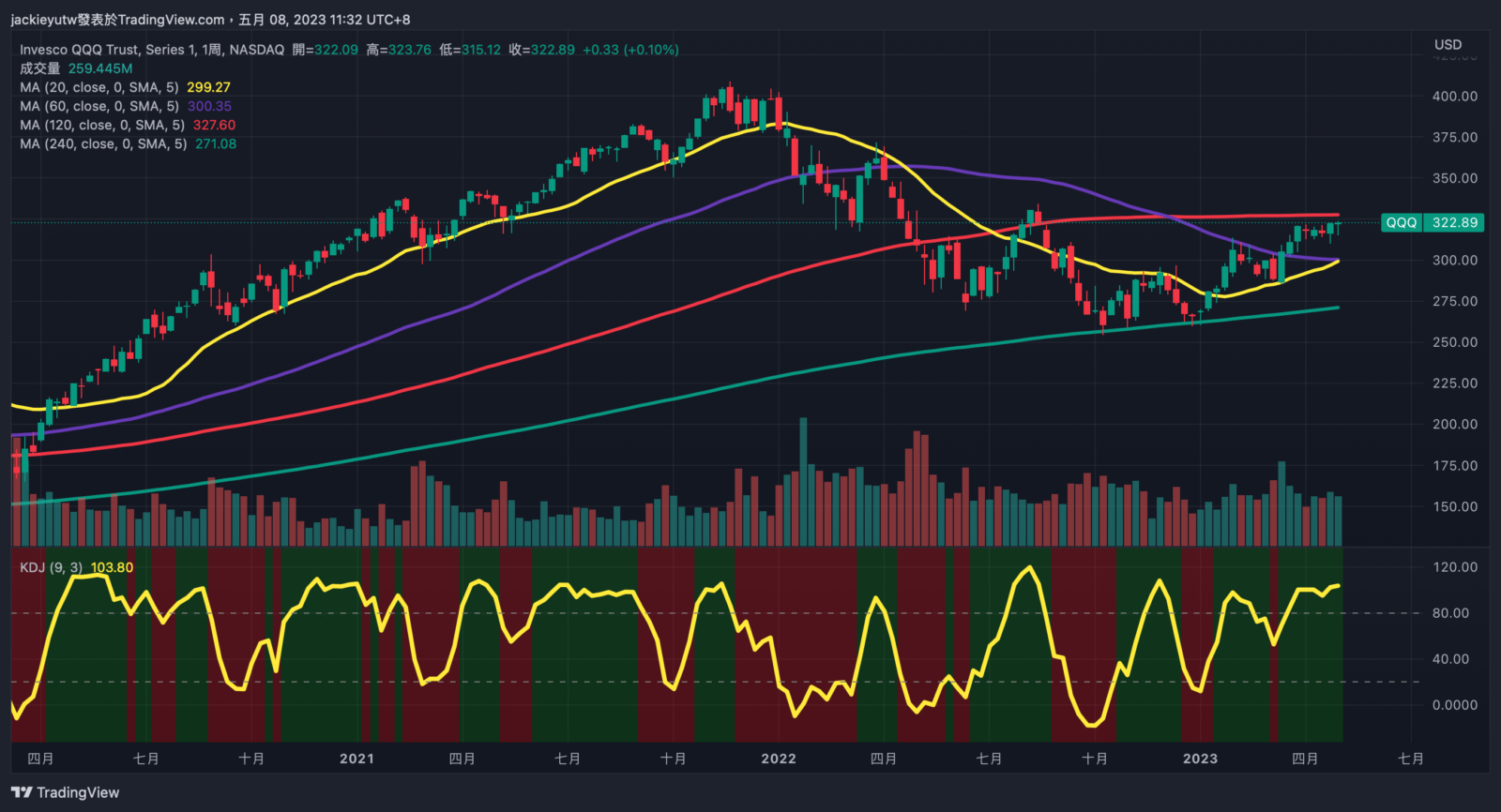 - 那指又創波段新高了!乖離再度拉高,看來想要佈局真的得再等等了,不管是 QQQ 還是 SOXX,目前都在高乖離區間,實在買不下手,有些會員朋友問我,會不會考慮佈建最近跌深的 KBW 相關金融股 ETF,說實在的,以 ETF 來說有這麼大的跌幅,的確滿吸引人,我在上週買了一些進行佈建,主因是近期現金水位過高,加上 KBW 成分股中,大型銀行股像是花旗、富國、小摩、美銀,大概佔了一半權重,小銀行比重不是特別大,這次操作更像是應對現金水位上升的佈局。