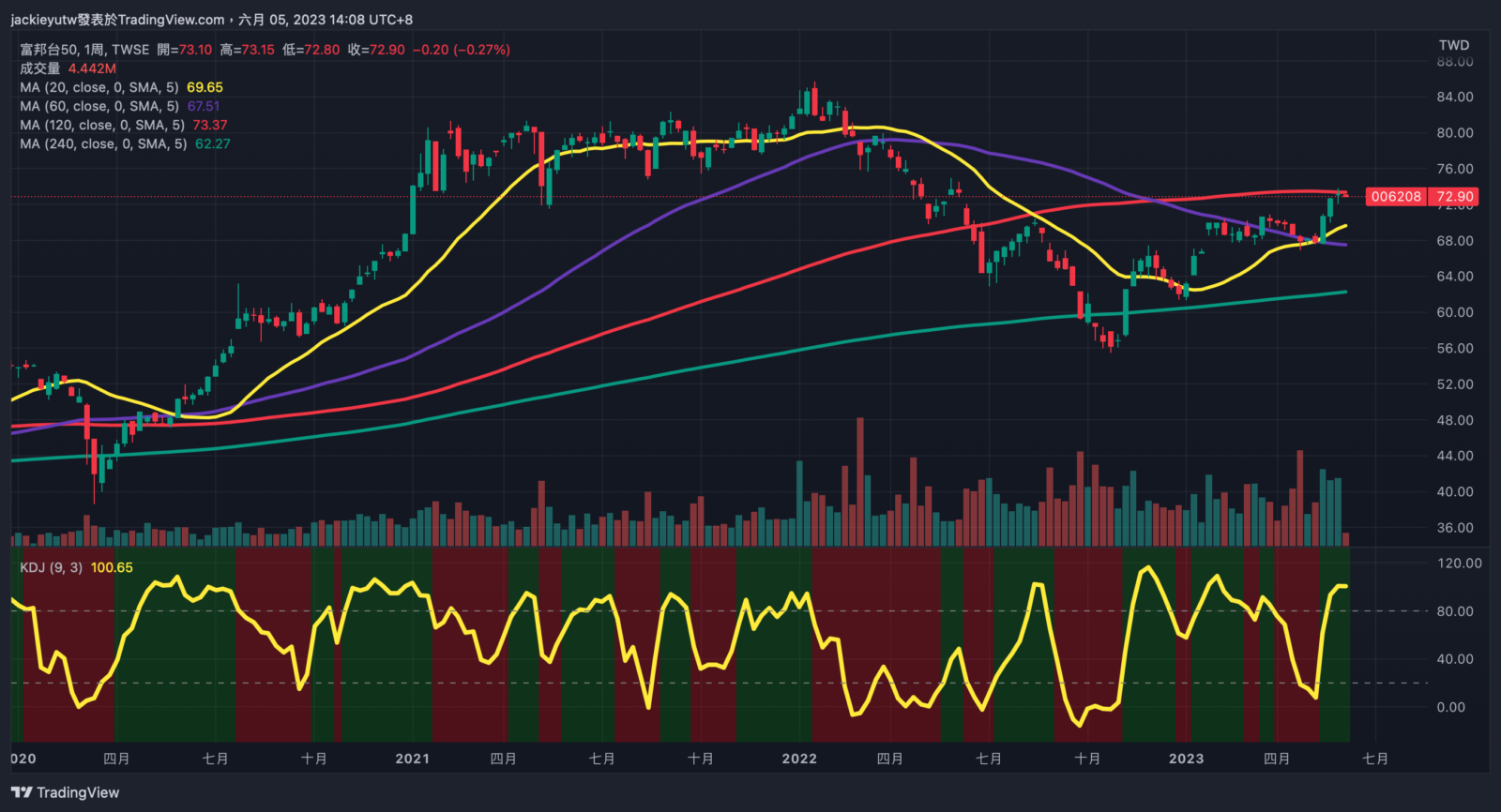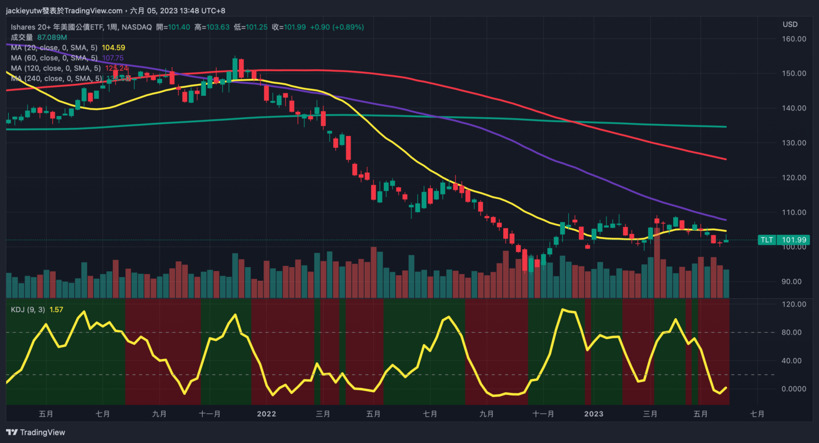 - 上週債券價格幾乎都在反彈,即便週乖離仍在長期低檔,我並沒有買入,因為成本價其實差不多,基本這一輪債券回跌我已經佈建滿多,本輪債券佈建,我是去年年底,升息尾聲時開始佈建債券,主要有三次佈建時刻,分別是在去年 10 月、今年 3 月與現在,老實說近兩次的乖離回調,價格都沒有破前低,讓我的債券平均成本價被迫拉高,TLT 成本價已經貼近於 100 元。