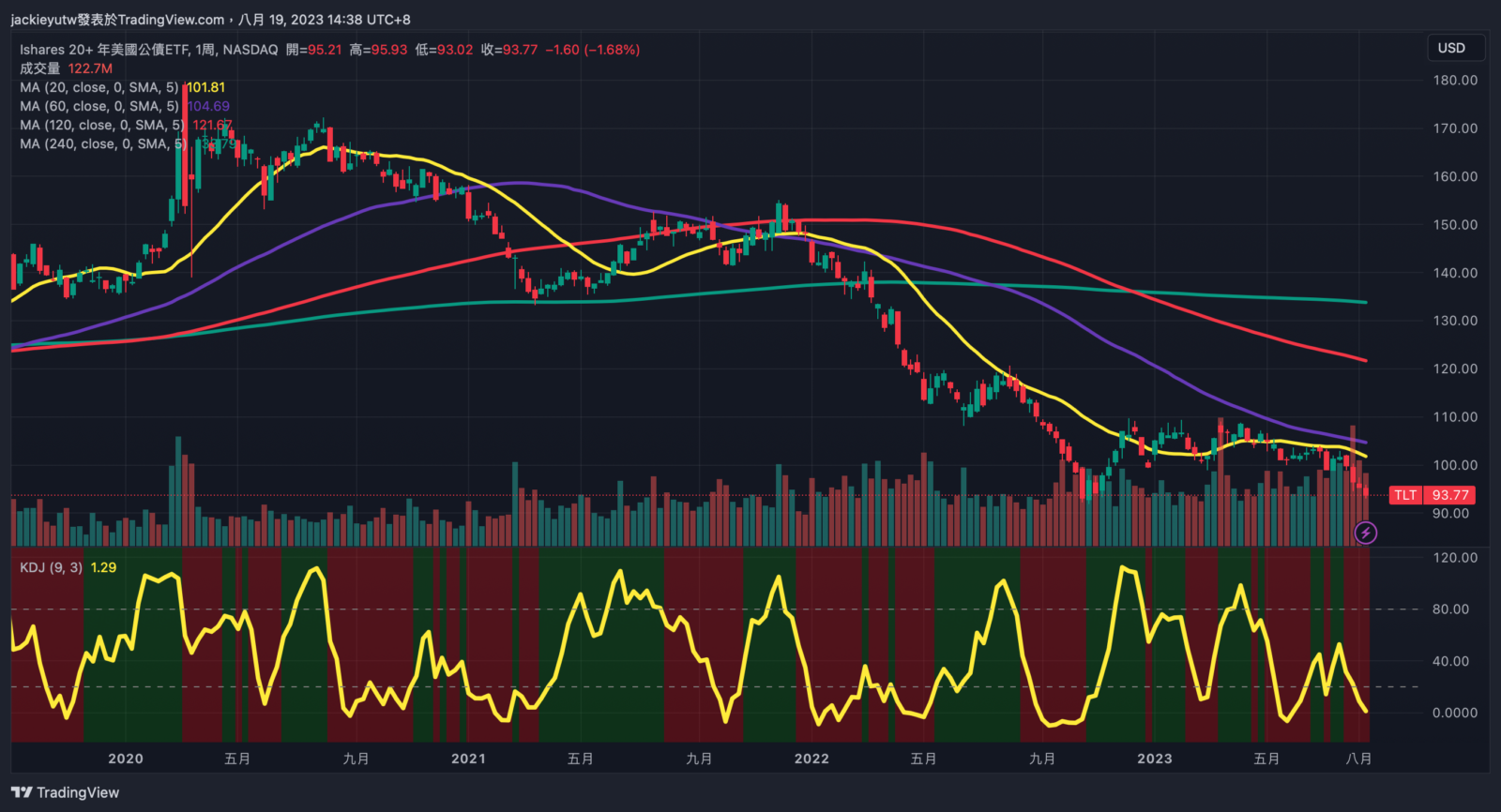 - 10 年期美債殖利率創下近年來新高,不過我持有的長天期國債 TLT 價格仍未破底,目前持續買入中,基本過去一年,債券部位的損益一直都不大,基本就是 -2%~+2% 之間遊走,目前的配置仍然是針對升息尾聲做佈建,不期待短期內降息形成的資本拉抬,目的是為沖銷景氣過熱回檔後的風險對沖。