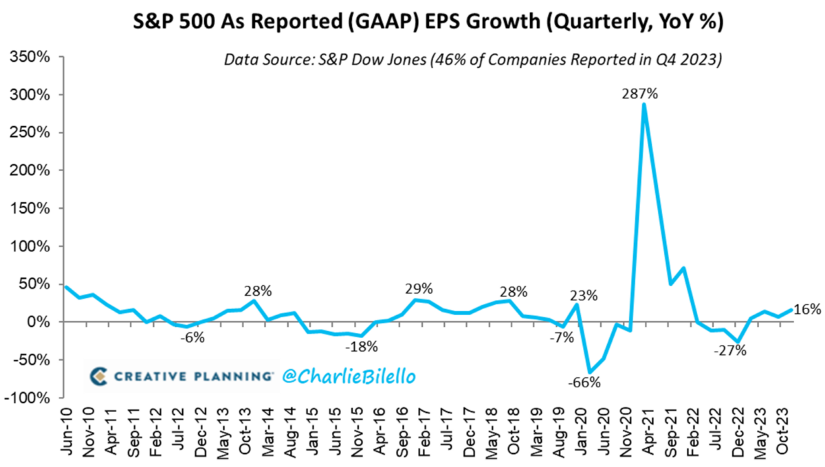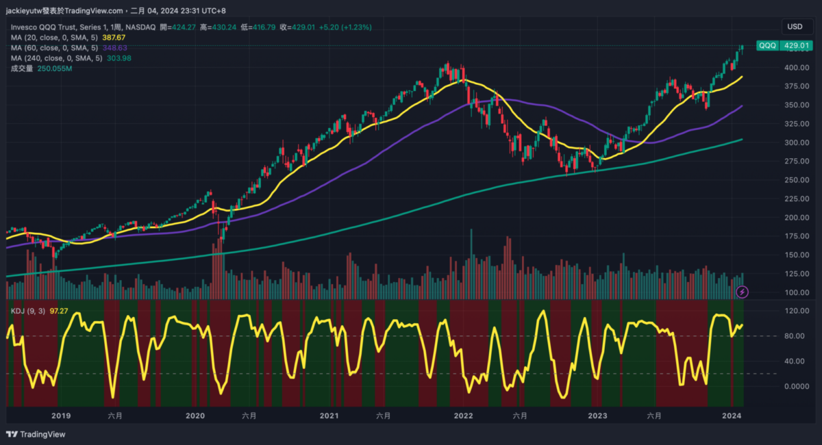 - 過去一週連回調都還沒等到,乖離又重新創高了,美股績效也創下新高,其中 QQQ 價格創下史高,主要由過去一週科技股財報貢獻,消費衰退還未到來,獲利衰退已經完全結束,目前標普 500 指數一半公司公布的財報,Q4 營收年成長 16%,連續四季正成長,事實上,獲利衰退早已在 2022 年 Q4 結束,當營收獲利創下史高,股價創高也是必然的事,符合我們過去的預測。