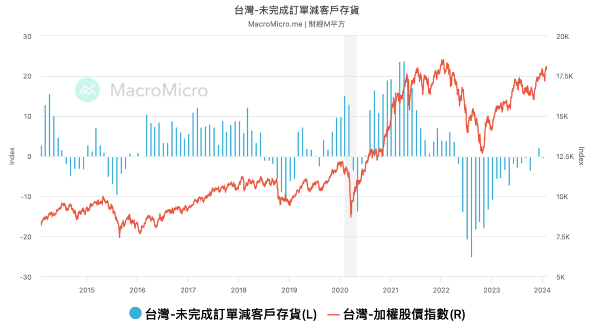 - 台股的部分也一樣,近期乖離也在高位震盪,許多人認為台股即將挑戰前高,將會有重重賣壓,然而,對我來說,現在仍然不是高基期,從下方未完成訂單減客戶存貨來看,每一次處於負值,都是極佳的佈建點,而當指標高於 10%,則是有過度擴張疑慮,目前來看,僅僅才剛剛進入復甦。