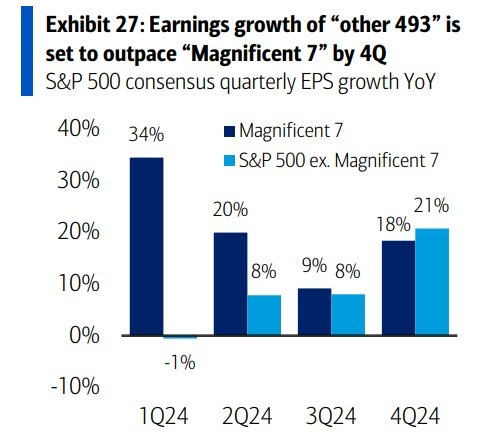 - 當然,即便指數再創高,並不代表大家的股票都是水漲船高,畢竟,目前多數獲利貢獻,基本都由美股七巨頭所拉抬,今年 Q1,市場普遍的預估值是,美股七巨頭獲利仍會有 34% 的增幅,然而,將七巨頭剔除後的標普 493 支股票,甚至還衰退 1%,一直要到今年 Q4,493 支股票的獲利年增才有可能超越七巨頭,這也是我採取 ETF 作為主要配置的原因,但一個股風險實在太大。