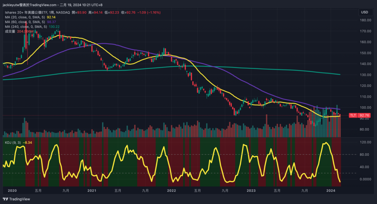 - 本來以為,現金水位會因為股價大漲而快速升高,好在美國市場在今年出現了明顯的股債輪動,最近 TLT 快速回檔,主因為市場降息預期持續延後,債券乖離也快速滑落,雖然沒有破前低,但在現金水位不斷上升狀態下,我決定持續買入債券。
