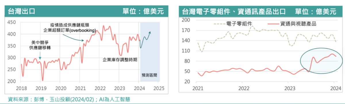 - 台股也在新春開盤後持續創下史高,不過,主要還是由台積電帶動,如果觀察扣除台積電的加權指數,目前仍未突破前高,這樣的情況其實更加奠定著目前景氣復甦期的位階,台灣 1 月的出口年增率擴大至 18.1%,創下 2022 年 4 月以來的最大增幅,而出口總值 371.9 億美元,也創下歷年同月次高。