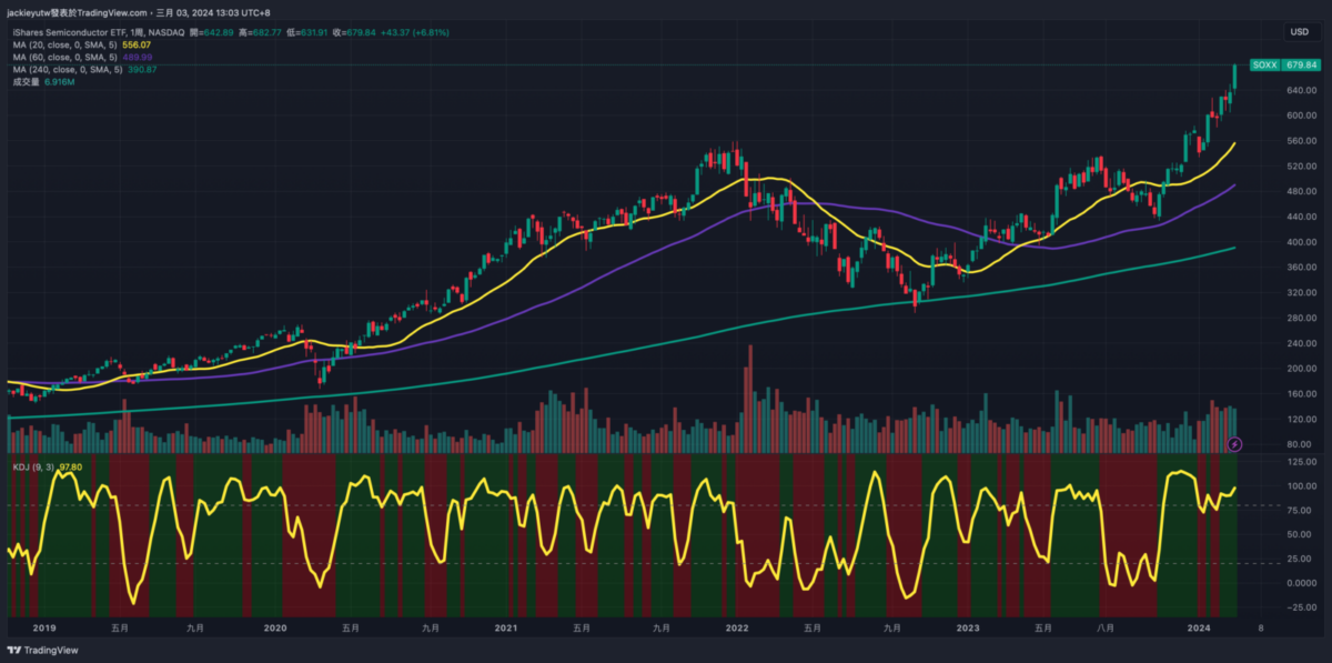 - 美股再創新高,獲利持續奔跑中,完全沒有任何佈建機會。過去一週 QQQ 周漲幅 2%,SOXX 周漲幅 6.8%,006208 跌幅 0.24%,看得出來,美股波動相對劇烈,帶動績效持續創下新高。目前的確乖離和本益比都在大幅推高,像是 SOXX 已經長達四個月保持高乖離,美股本益比也從 17 倍飆高至 20 倍,但仍然沒有達到極端泡沫的程度。