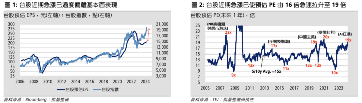 - 舉例來說,台股企業獲利預估值並沒有太多變化,EPS 大約還在 220 元左右,距離 260 元的高點還有一段距離,然而,股價已經創下新高,預估本益比從 16 倍急速拉升至 19 倍,這樣的估值已經超出長期均水準 15 倍的標準,所以,我預判台股接下來將由狂牛行情轉為慢牛行情,即將由多頭急攻轉為高檔震盪,等待基本面的回溫,也就是中期回調即將到來。