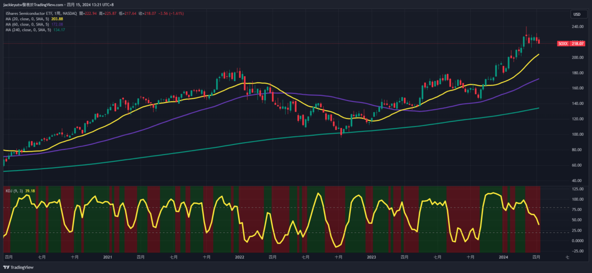 - 目前費半的 SOXX 乖離下滑至 39,我開始加大建倉步調,目前的規劃是,要在本輪中期回調,把現金部位比例壓回到 10% 以下,確保資產能夠伴隨著景氣繁榮週期大放異彩,如果回調幅度不大,股市又重新進入乖離上行,那我也會把剩餘資金投回投資等級債和短債,當作類現金領取配息。