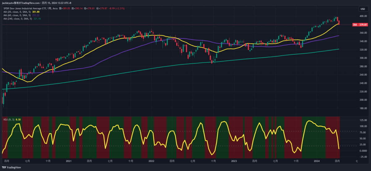 - 事實上,目前最為領先下跌的,是追蹤道瓊的 DIA,乖離從 100 以上,下滑至 8,雖然我更加相信生產力循環推動者,是由科技股的費半和那指主導,但特別擔心本輪回調幅度太低,於是也買了一些 DIA,也算是產業的一種分散。