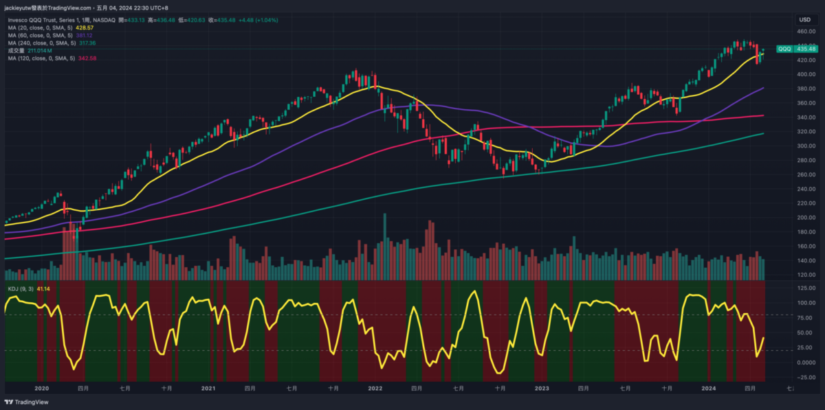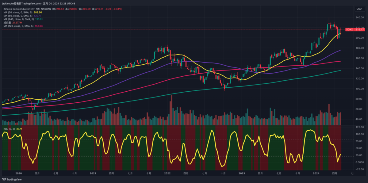 - 過去一週美股乖離嘗試於下方築底,我在週三週四左右建立一些部位,包括 SOXX 與 QQQ,不過因為週五大彈,週線收了一根下影線,目前暫時停止買入,如果美股本輪是標準中期回檔,有很大的機會來回測底,不過,這次 QQQ 反彈過快,週乖離已經來到 40 以上,反而是費半比較有佈局的空間。