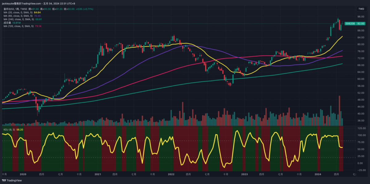 - 台股部位則是真的跌得有夠慢,乖離甚至還在 50 左右游走,本週台股股沒有佈建空間,雖然四月份,有趁股價重挫時買了幾張 006208 與正二,但金額並不大,對資產部位影響較小,有點漚,算是見識到這波內資的瘋狂,我原本的預期值,雖然股價跌不太動,但至少乖離可以低檔鈍化,結果又拉上去了。
