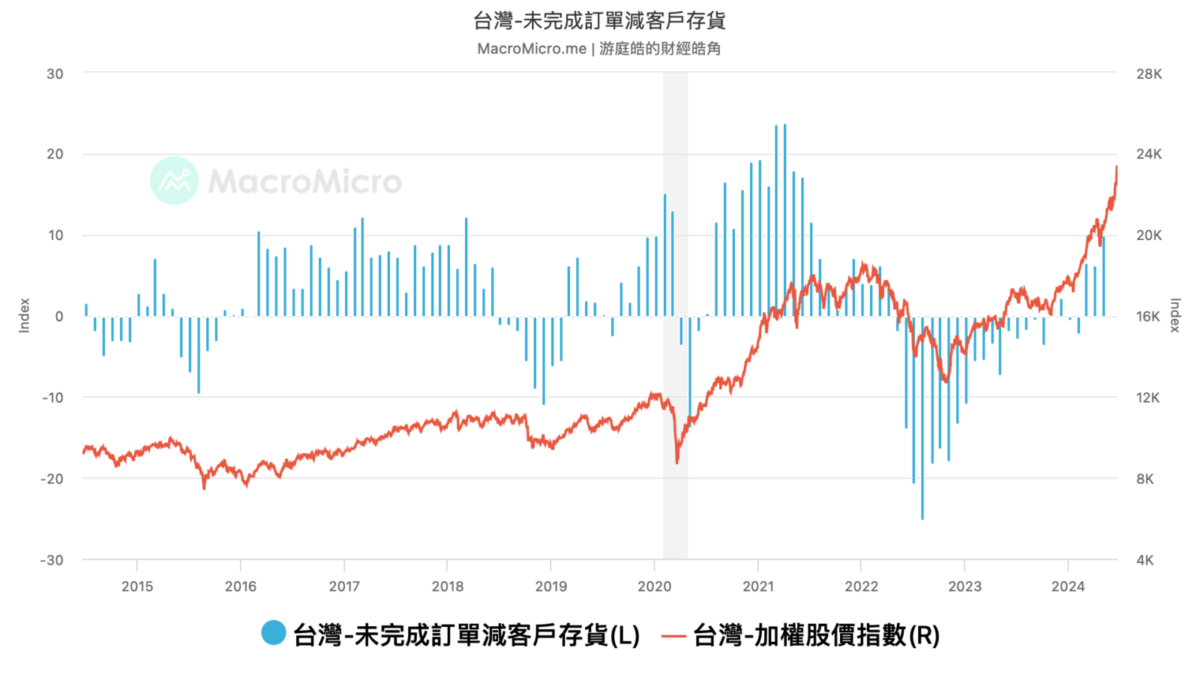 - 以未完成訂單減客戶存貨指標觀察,這項指標在 2021 年末時就已經見頂下彎,但股市卻還再創高,所以的確有下跌風險,2018 年中旬,指標也開始提前轉為負值,但股市卻仍於高位震盪,這項指標我相信可以作為重要判斷要件。