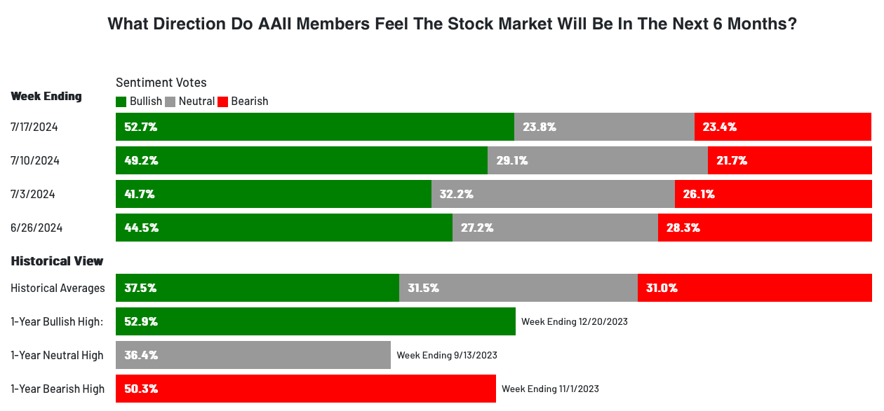 - 從情緒指標觀察,短期內 AAII 散戶情緒指標,過去兩個月本來就有過度樂觀的情緒在,但這項指標不是拿來判定泡沫破滅的,而是判定乖離的高低,平均來看,長期看多者佔 37.5%,看空者為 31%,如今看多者在上週高達 52.7%,接下來就看需要花多久時間冷卻。