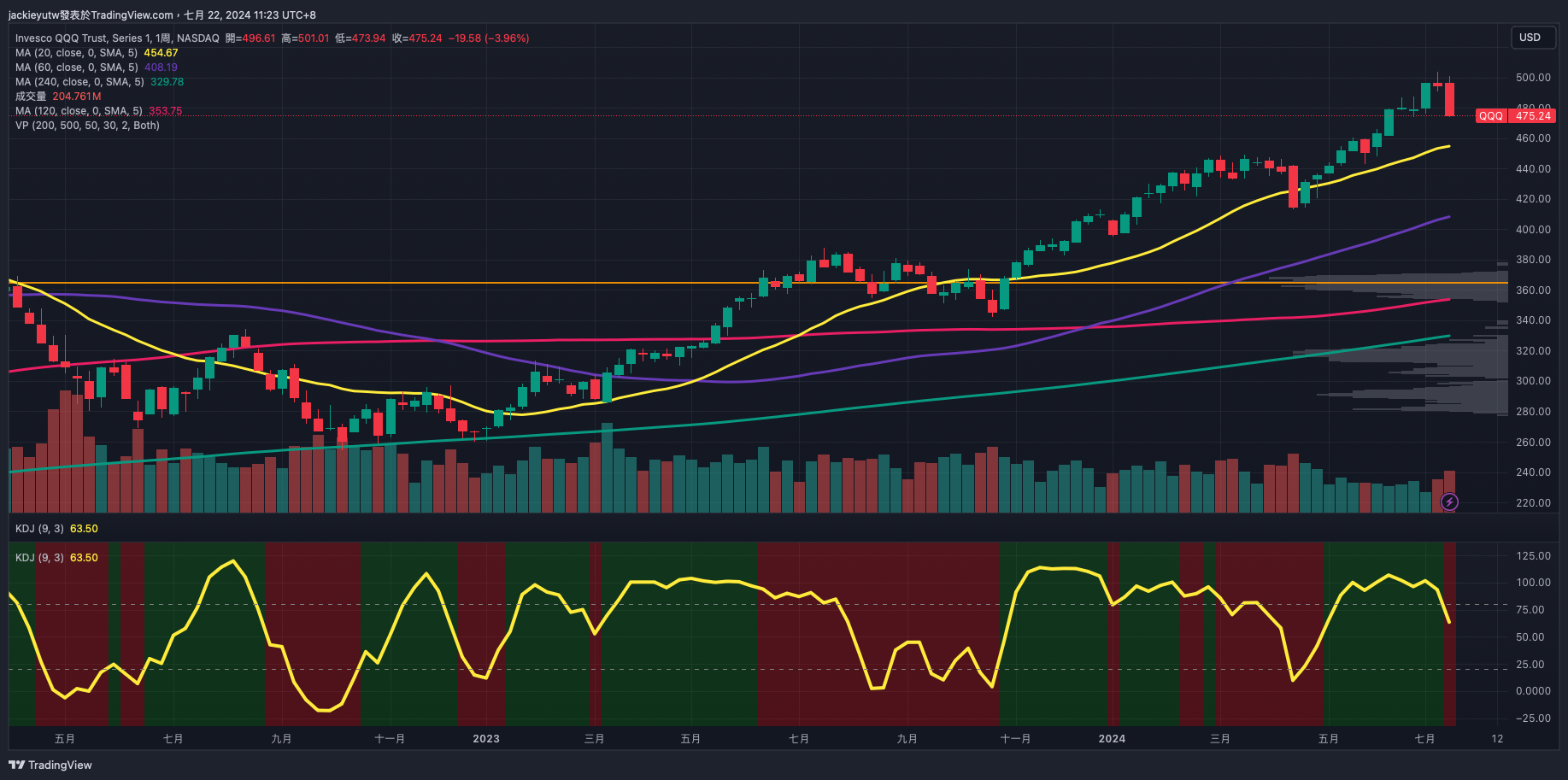 - 終於看到了大場面,過去幾天台美股市賣壓沉重,週乖離終於適度下滑,不過幅度也沒有很大,SOXX 週乖離下滑至 38,QQQ 甚至還在 63,其實還沒有到中期回調佈建的標準,頂多是撿個幾股心情舒服一下。