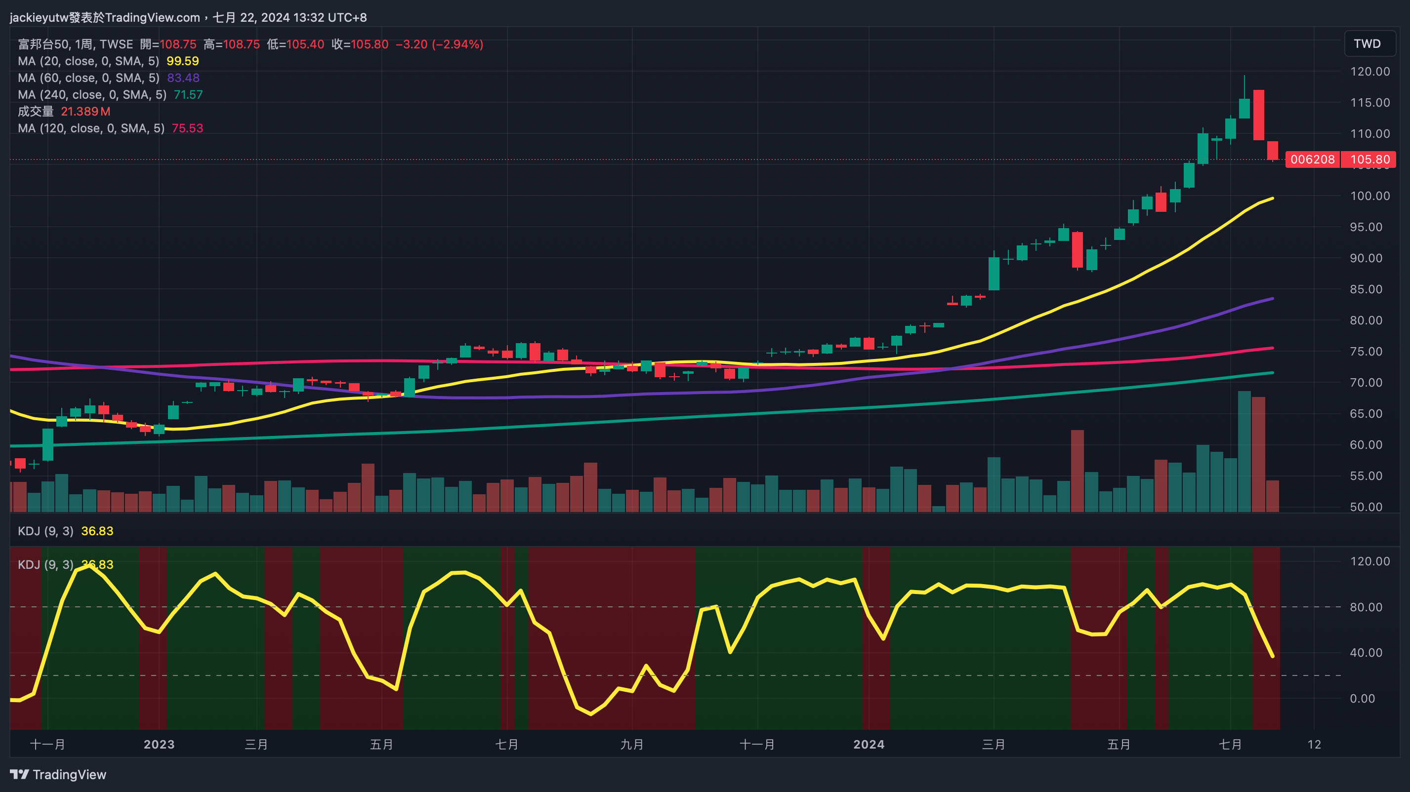 - 尤其,台股在今年以來績效亮麗,跌幅也加重,雖然乖離仍在 36 左右,但已經是去年十月份以來的最大乖離修正幅度,我於今日 (7/22) 開始重新進場,當然既然我將其視為中期回調,基本就是以三個月的尺度看待做佈建,現在不適合一次大筆投入,慢慢買入即可。