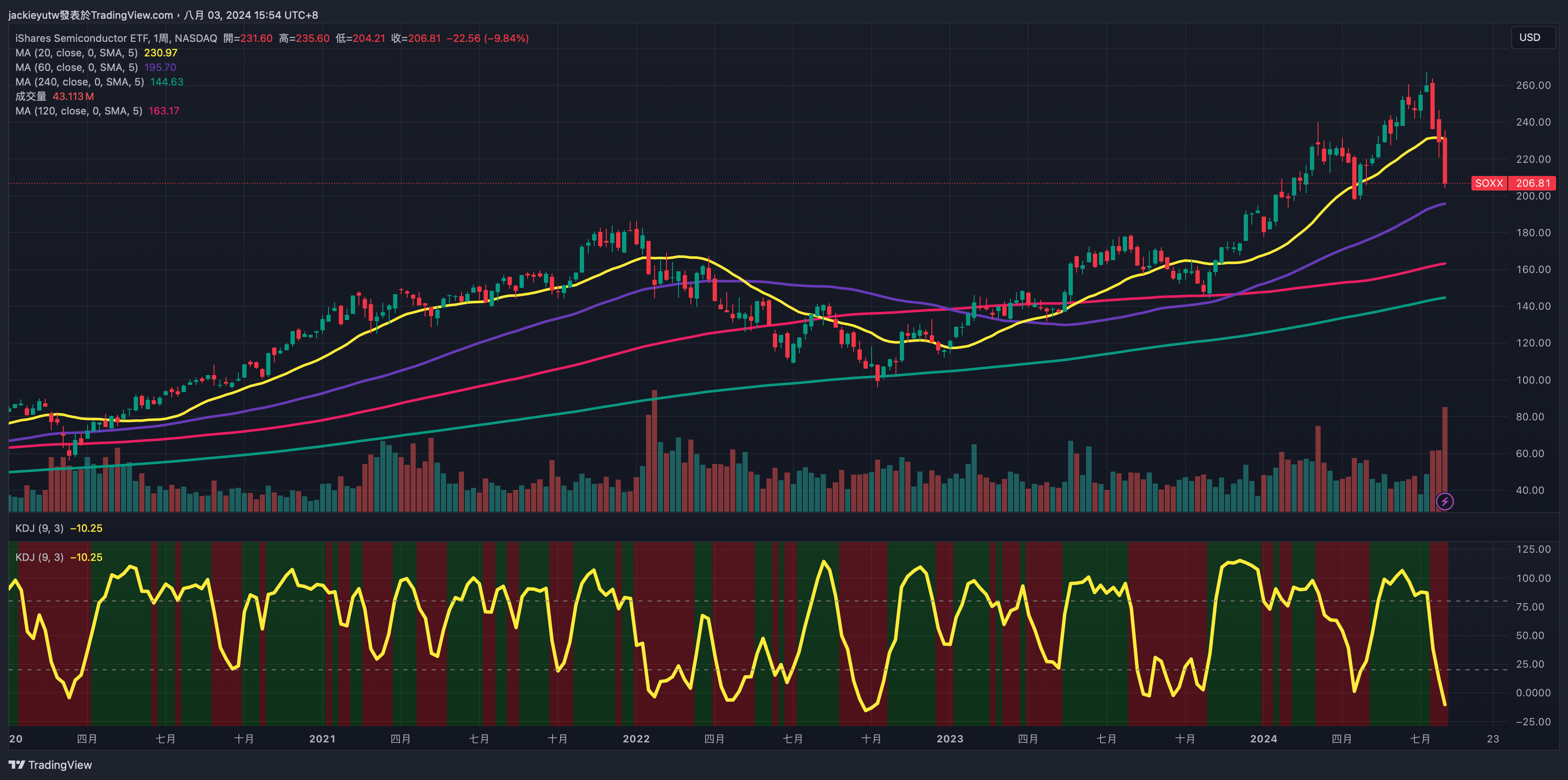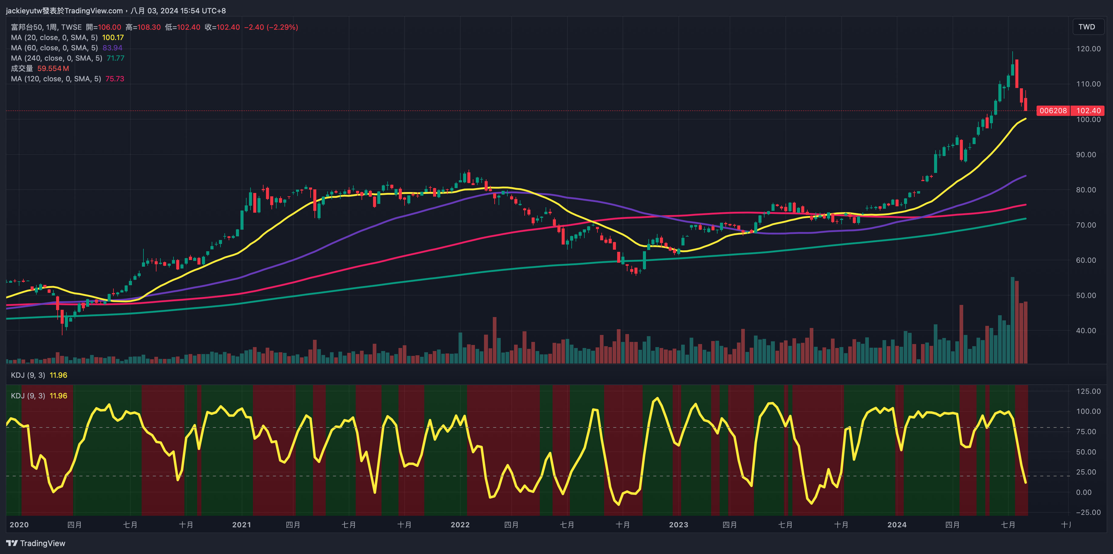 - 本周美台股市殺聲隆隆,費半一週跌了 9.8%,自高點跌了 22%,那指周跌幅 3%,自高點跌了 10%,台股 006208 周跌幅 2.29%,跌幅高達 14%,下跌速度相當快速,也讓市場情緒快速降溫,尤其在台股交易量急縮,看起來大家都在觀望。從週乖離來看,那指和費半週乖離都已經進入負值,台股則是 11,這是去年 10 月以來的最大回調。