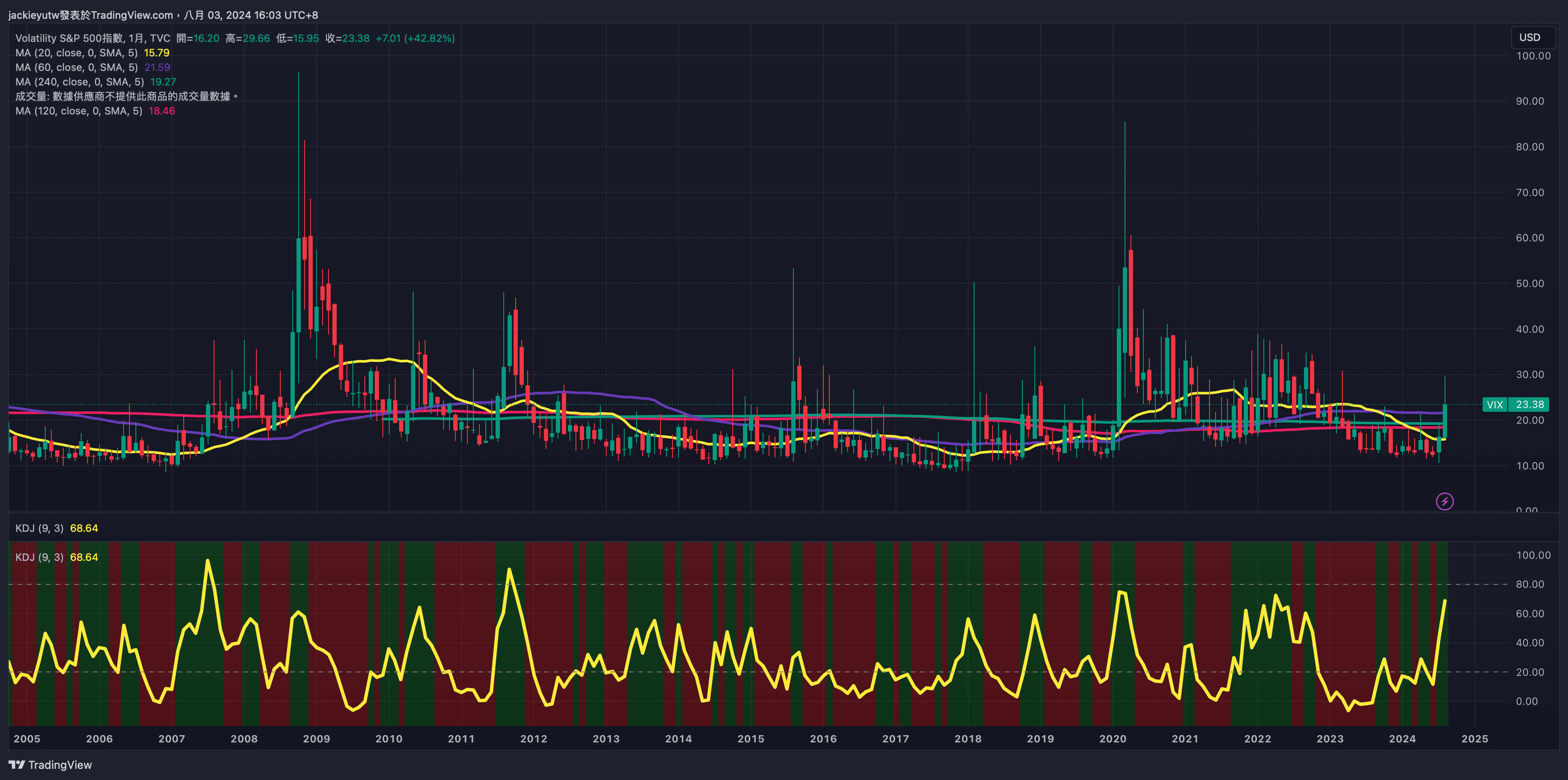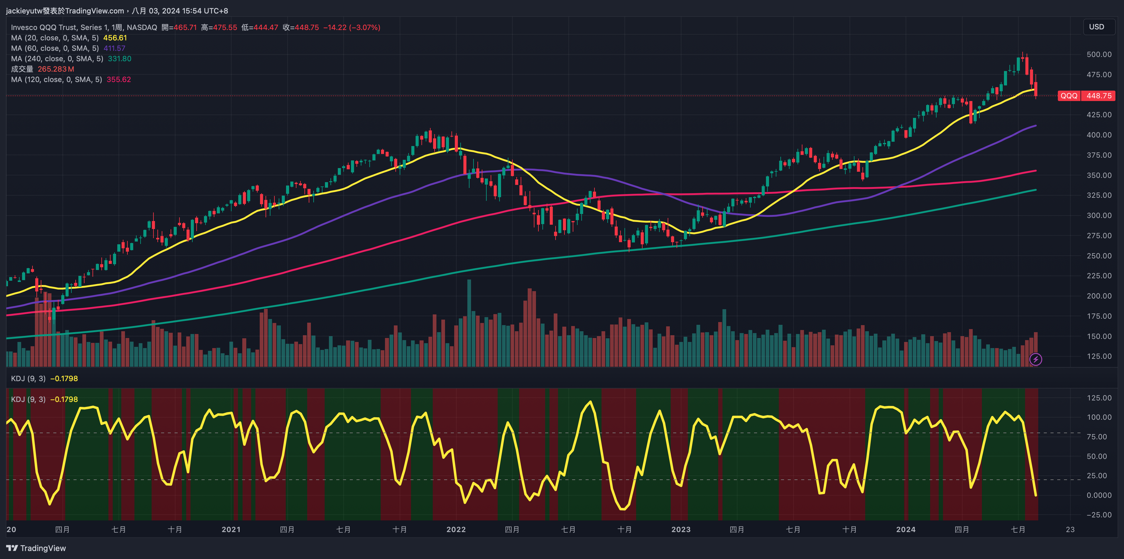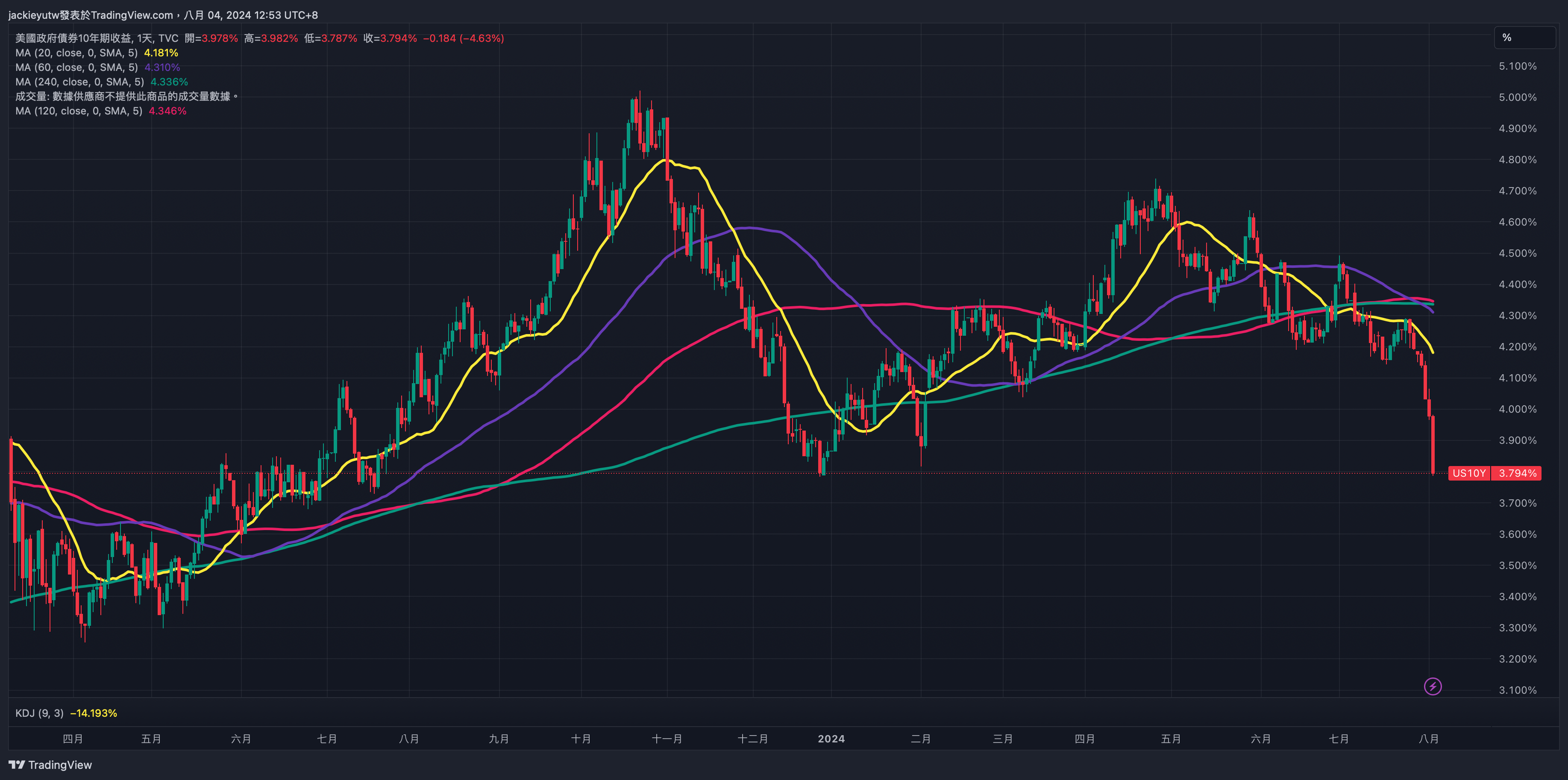 - 隨著降息預期發酵,加上經濟隱憂預期,導致十年期公債殖利率快速滑落,我持有的長天期公債 TLT 和公司債 00720B,績效皆創下今年來新高,尤其長債 TLT 一個月漲了 9%,雖然績效離大盤仍有一段距離,但在本輪恐慌性殺盤中,沖銷了部分資產波動風險,這就是過去幾個季度進行股債配置的用意,但除非有現金抄底或急用需求,債券的出脫時間,最好等到衰退已經發生,聯準會進入緊急降息後。