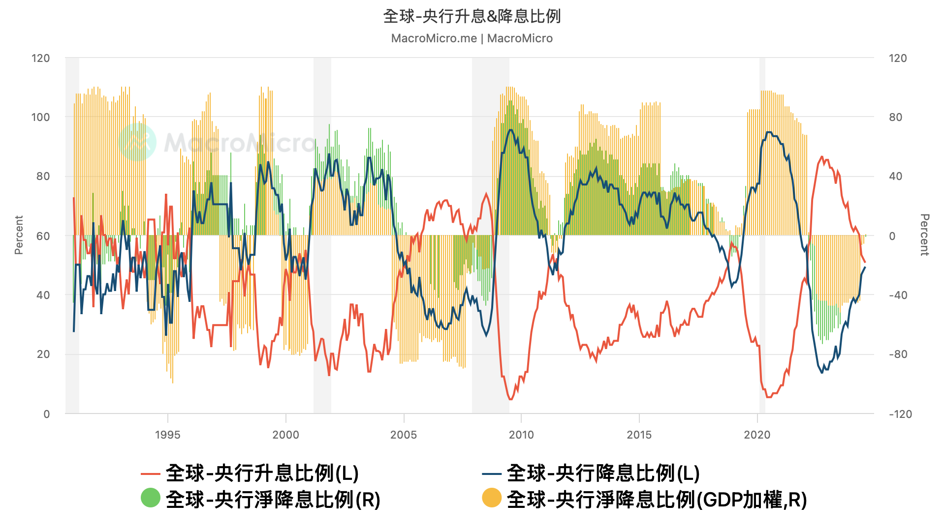 - 目前全球央行升息比例已經從 2022 年的 9 成,下滑至 5 成,隨著央行降息比例大於升息比例,債券的主升段就會因此展開,到時如果股市真有顯著衝擊,急需資金抄底再售出也不急。所以,週期投資的用意,就是確保任何資產都買在相對低位,確保在股市或債券回調時,有更強的忍受回調能力,如今股市獲利雖在回吐,但股債資產都是正報酬,反而有更多長期投資的動力。