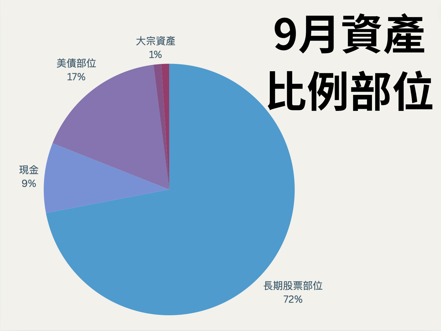 - 來到十月份後,目前資產比例中,隨著股市反彈債券回檔,股票部位持續擴大至 73%,債券則下滑至 15%,從在股債平衡邏輯來看,我過去一個月僅適度回補債券,如果以庫存循環角度來看,等於我在庫存循環的中段,持有了 74% 的股票,剩餘 15% 的債券,則是下一輪主要抄底的資金。