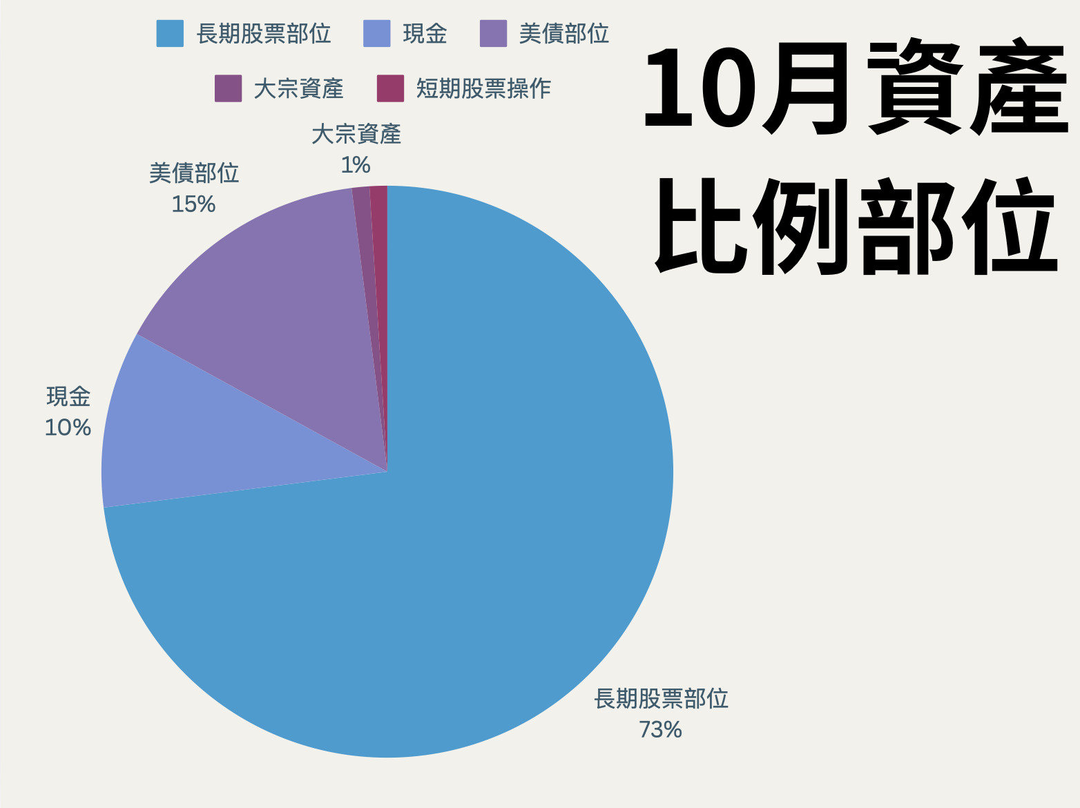 - 整體部位來說,雖然債券下跌,但是科技股跌更多,股市部位從 73% 下滑至 71%,美債則下滑至 14%,現金來到 13%,有點壓力,本業收入沒增加多少,但現金比例卻變高了,由於債券利率持續攀升,我又回補了些債券,壓一下現金部位。
