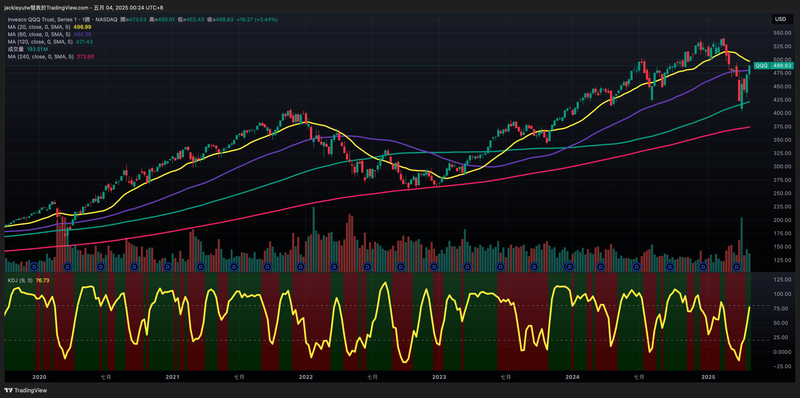 - 股市部分,SOXX 周漲 2.82%,自低點上漲 20.5%,QQQ 周漲 3.44%,自低點上漲 11.5%,從周乖離來看,本輪反彈幅度已大,且股價基本都已收復了 4/2 對等關稅以來的所有跌幅,情緒也沒這麼悲觀了,恐懼貪婪指數回到 4 字頭。