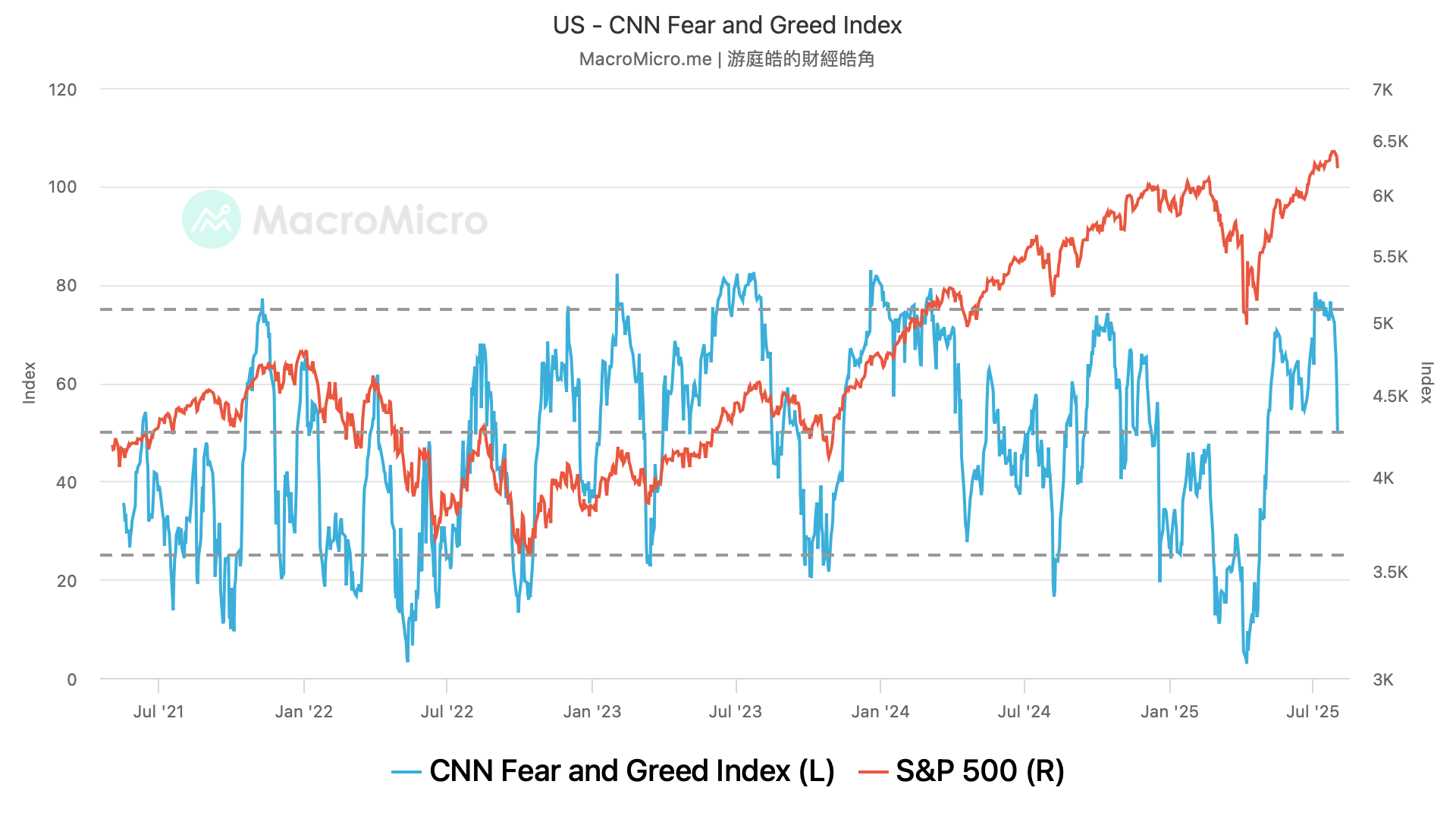 - 從情緒面來看,CNN 恐懼貪婪指數已回到 50,情緒正在快速收縮,這項指標僅能夠幫助判斷當年度的低位,但無法判別景氣高低,比如像 2022 年,也會有樂觀和悲觀的時候,而當時卻是標準的庫存調整年,股價持續破底了三個季度。