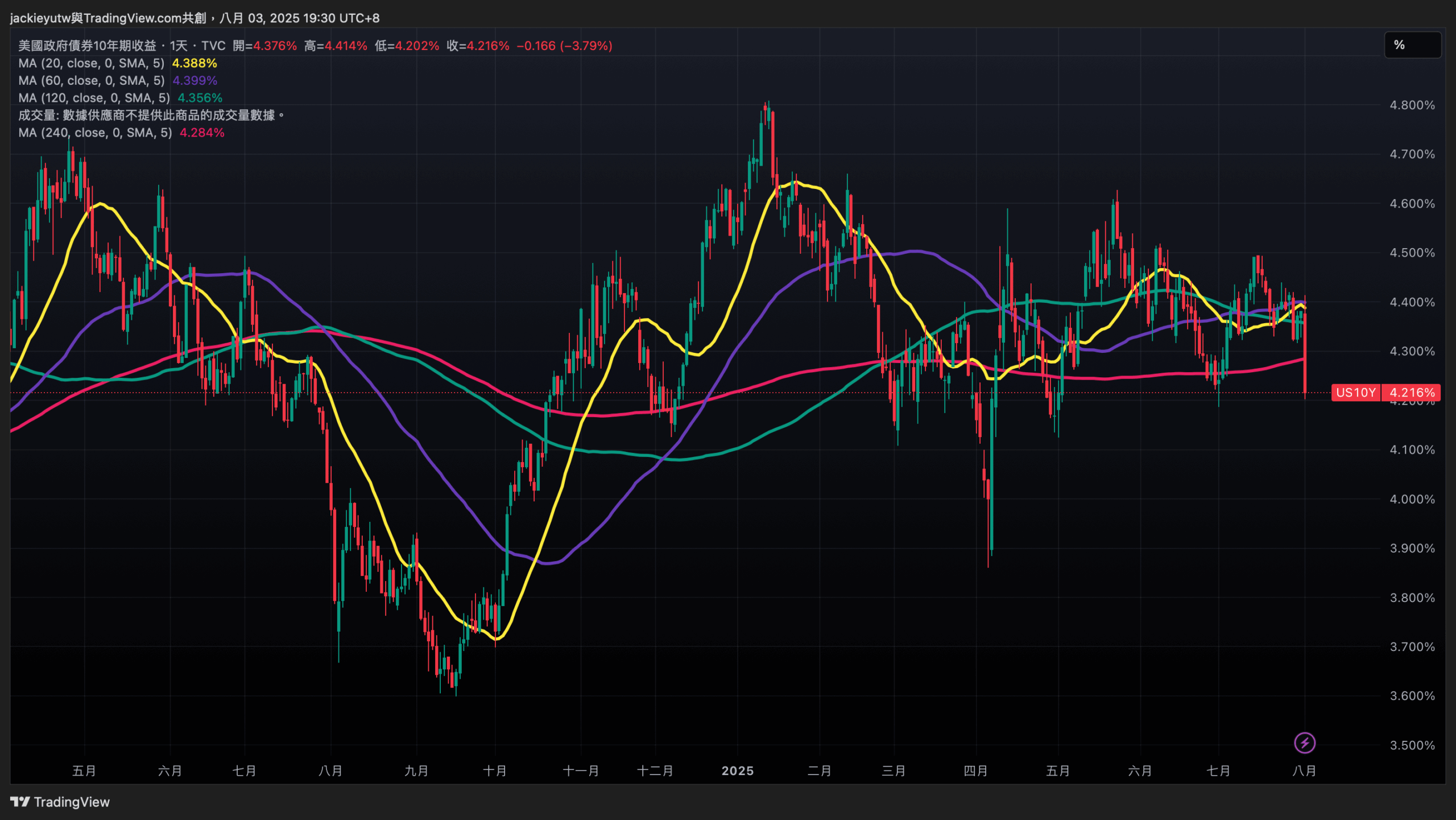 - 甚至,這段時間,川普的關稅戰,讓大家的通膨預期出現反彈,使市場對聯準會抗通膨的信心下滑。儘管之後通膨數據略有回落,6 月 CPI 仍上升 0.3%,而 10 年期殖利率,在本週五前,也一直維持在 4.4% 以上,甚至數次突破 4.5%。