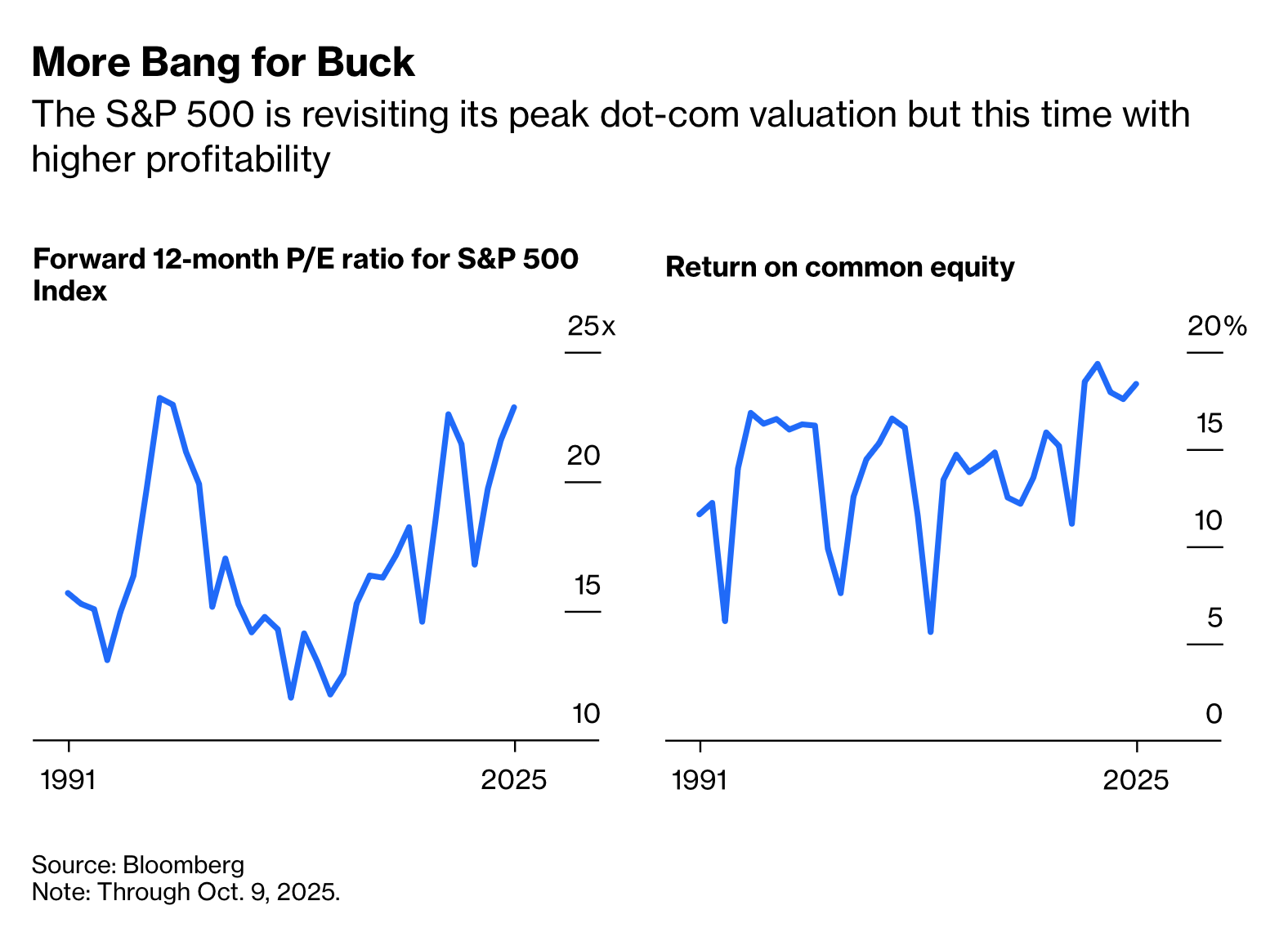 - 如果以標普 500 指數的預估本益比來看,目前在接近 24 倍,幾乎與 2000 年網路泡沫頂峰相當,然而股東權益報酬率 (ROE) 則接近 20%,遠高於當年約 10% 至 12% 的水準。