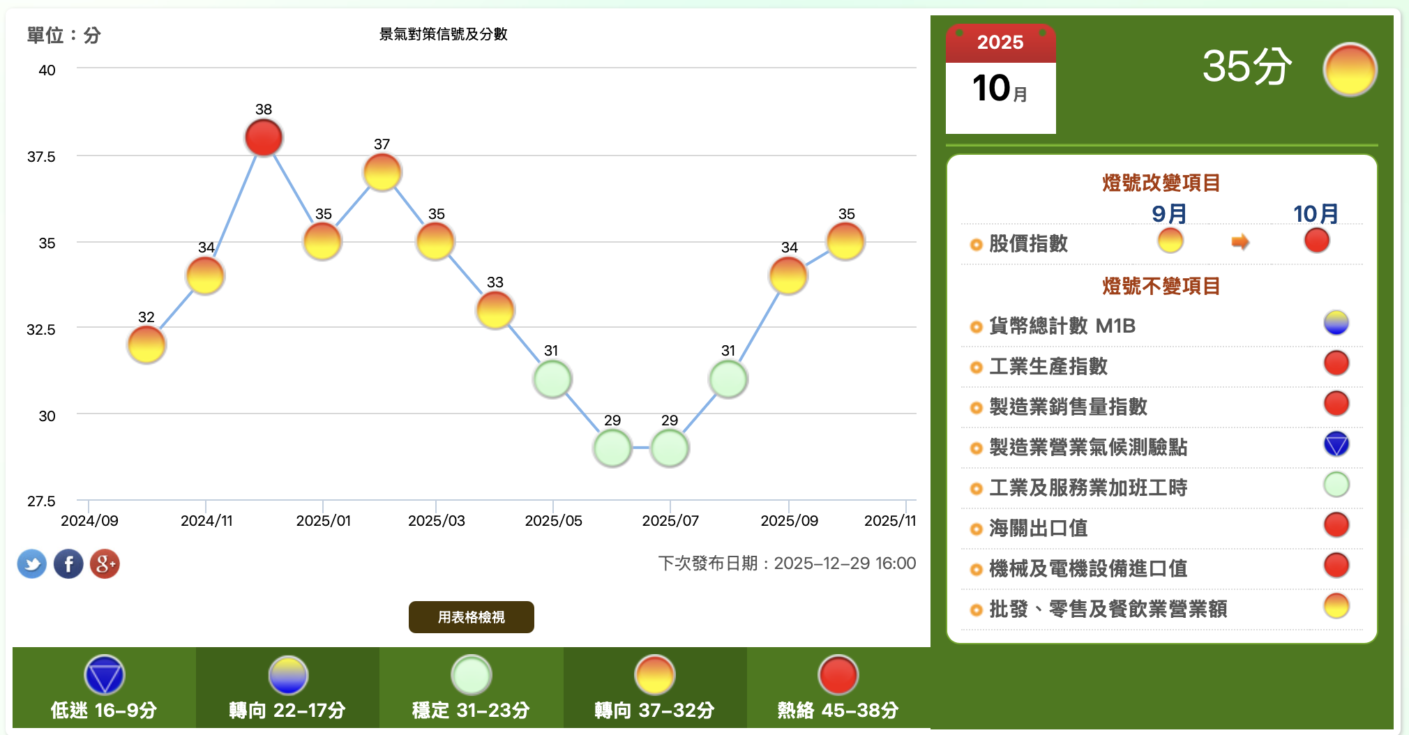 - 不過,如果持股部位比例偏小,甚至連一半都沒有達到,還是可以考慮,在本輪景氣全面進入榮景景前,至少佈局站資產比例 50% 的持股,一方面是情緒指標目前仍屬於低位,另一方面最近景氣指標的確已經開始築底,以台經院的景氣動向指標,10 月製造業、服務業與營建業營業氣候測驗點同步走高,景氣燈號也開始向上走。