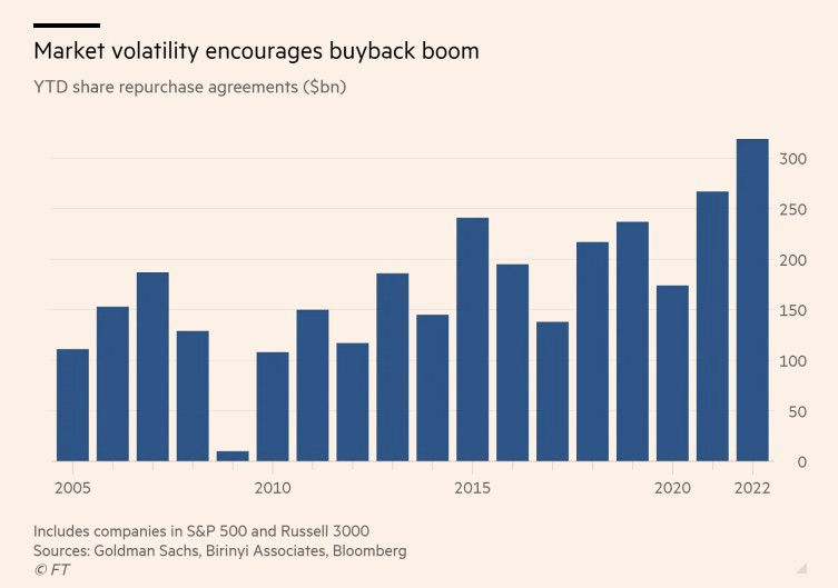 首先,我們要了解股市與經濟的連動關係,股市通常領先一個季度到兩個季度反應經濟,所以,股市資金是經濟的前瞻指標,有趣的是,如果以第一季觀察,美股雖然在走跌,但美國企業在今年第一季的庫藏股回購數量,已經創了歷史新高,來到 3190 億美元,去年同期才 2670 億美元,也就是說,當美股第一季陷入烏俄衝突引發的修正,大量的美國企業選擇趁機撿自家股票的便宜。