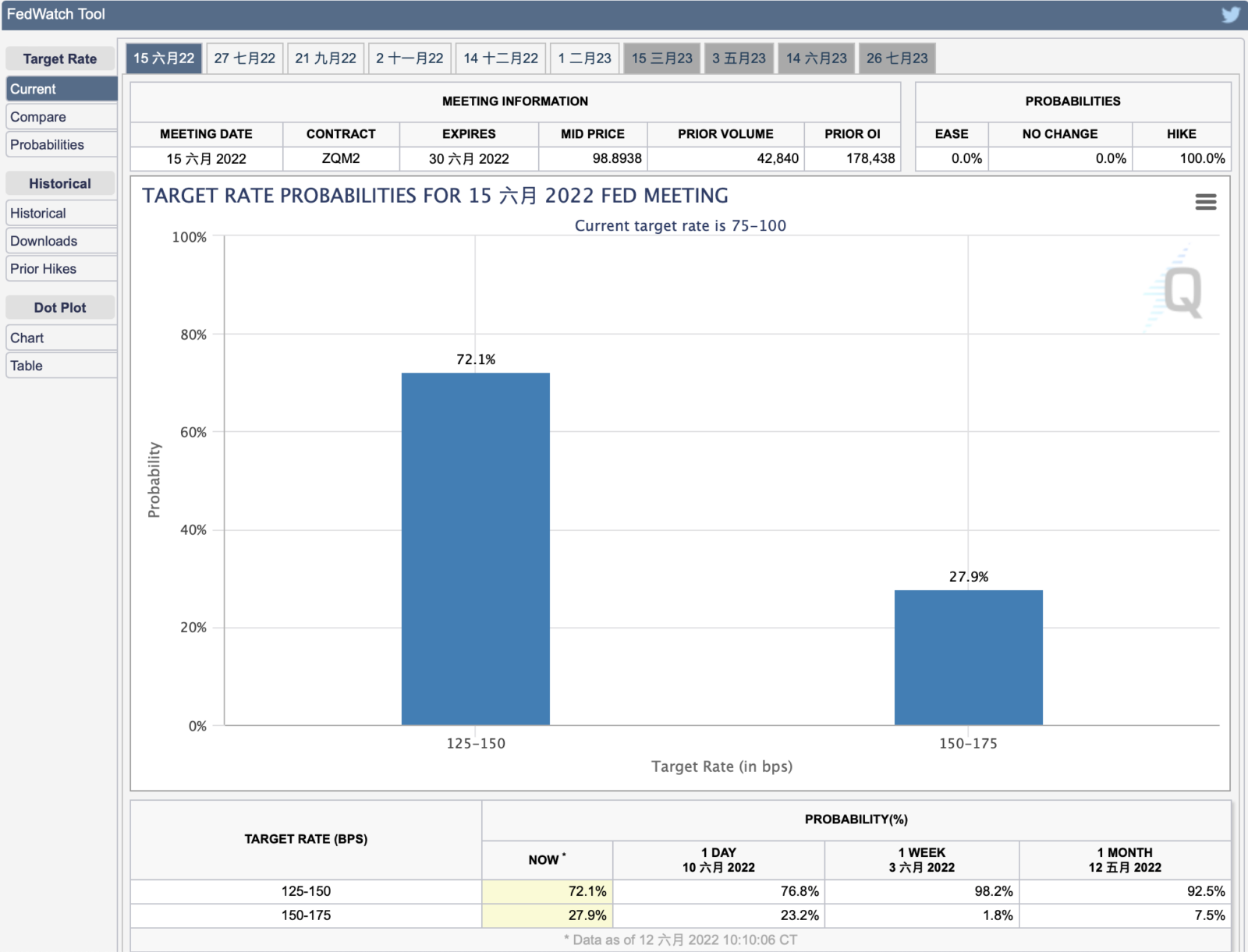 2022/6/13 六月升息機率:兩碼 (72.1%) 三碼 (27.9%)