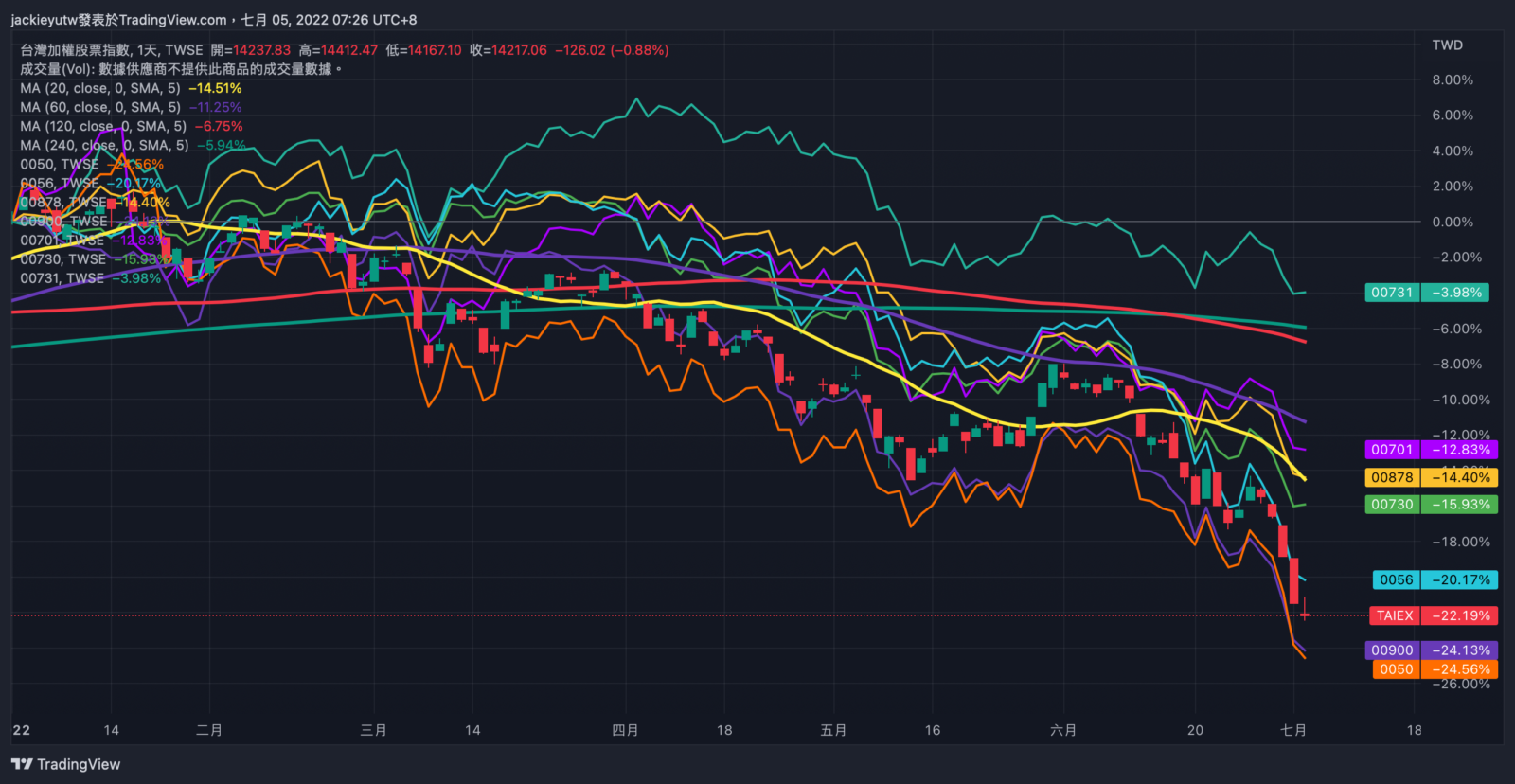 如果回顧我在上半年的資金投入,主要分為三類市場做投入,分別是台股與偏向成長股的那指與費半,並且刻意避開跌幅較輕的價值股,比如道瓊或者傳產股,等於是買入跌幅最大的指數與市場,我相信長期追蹤我的投資朋友都很好理解,週期投資的用意不是賺取短期的投機財,或者把自己當作基金經理人,嘗試穩住當下的基金績效。