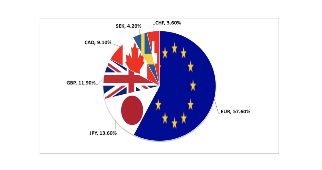 以美元指數觀察,這項指數是衡量美元在國際外匯市場匯率變化的一項綜合指標,由美元對六個主要國際貨幣的匯率經過加權幾何平均數計算獲得,歐元佔比 57.6%、日圓 13.6%、英鎊 11.9%、加幣 9.1%、瑞典克朗 4.2%、瑞士法郎 3.6%。