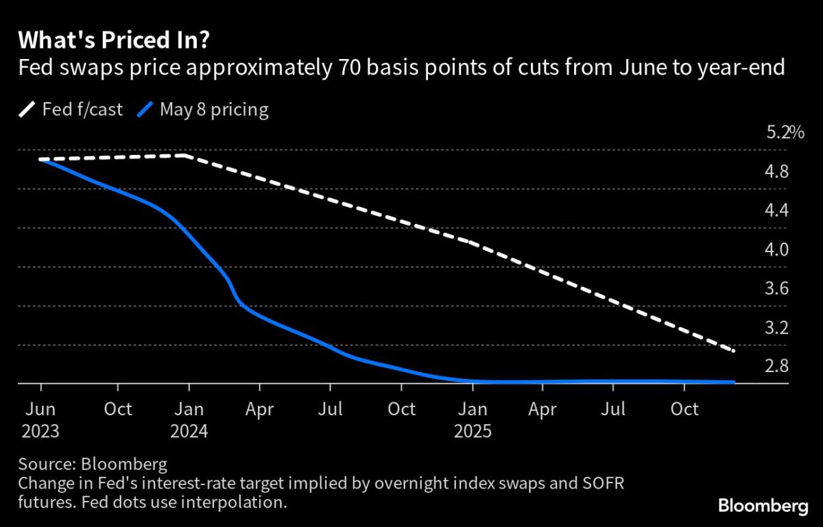 (白線:聯準會點陣圖利率/藍線:市場於五月初預估值)