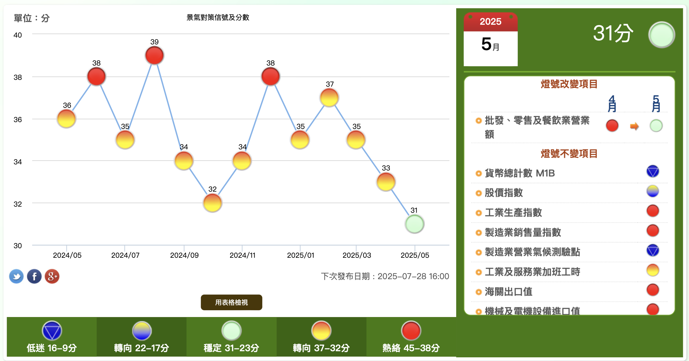 這週五,台經院公佈 5 月景氣對策信號燈,燈號從前四個月的「黃紅燈」 (偏熱) ,掉到「綠燈」 (穩定) ,分數也從 4 月的 33 分,降到 5 月的 31 分,剛好踩線轉燈,這讓不少人開始擔心,是不是台灣景氣要走下坡了?但實際深入看,這次燈號的轉變,其實沒有想像中那麼糟,甚至某種程度上,是統計上的誤會,但仍然不會改變景氣擴張末段的現實。