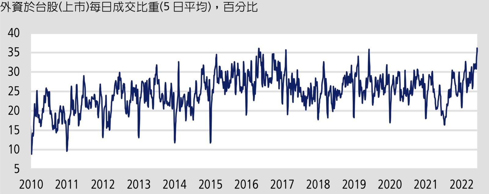 - 從數據回測可以發現,雖然外資不斷賣超台股,今年以來外資成交比重佔總成交量的比率不斷升高,這說明散戶上半年交易情緒越來越低,我也相信盤得越久,股市到時下殺力度,突破散戶買盤防線的機率也會變高。