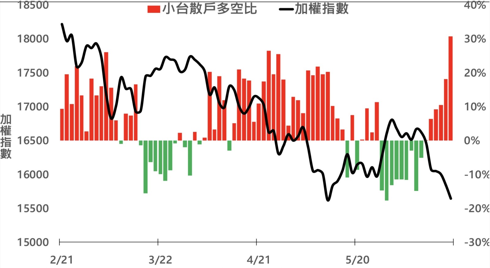 - 當然,從投機性散戶市場觀察,小台散戶多空比來看,最近投機性散戶空單突然暴增,做多情緒濃厚,本週股價果然跟散戶反著走,但週五空單突然來個超級暴增,有一點短期跌幅來到極端值的感覺,也許下週台股會有適度反彈,我在週五又進了些許倉位,其實按照左側交易的邏輯,不該在本週建倉,因為指數還未破五月中旬的低點,但台積電和權值型 ETF 都跌破了,也就是電子股賣壓比大盤重,我就忍不住撿了一點,本輪空頭我的投入資金台股比美股少很多,期待台股的補跌行情能夠出現,要不然看台股手中部位,甚至都沒比去年五月嚴重,真的不希望主力和政府一路護盤到年底。
