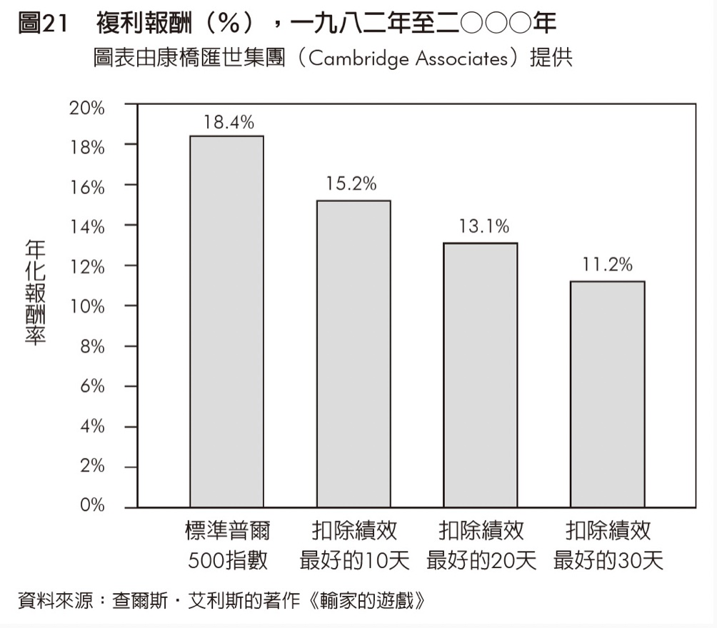 - 以下圖來看,1980 年代到 2000 的大牛市,標普 500 的年均報酬是 18%,如果你把績效最好的十天扣掉,就下滑到 15%,如果把績效最好的 20 天扣掉,就會下滑到 13%,30 天就會掉到 11%,不要看只是幾% 的報酬,我們說的是年化產生的複利差距。